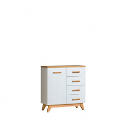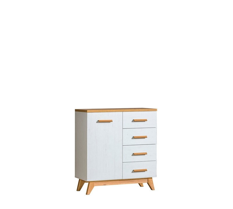 Komoda s jedněmi dveřmi, jednou policí a čtyřmi zásuvkami.