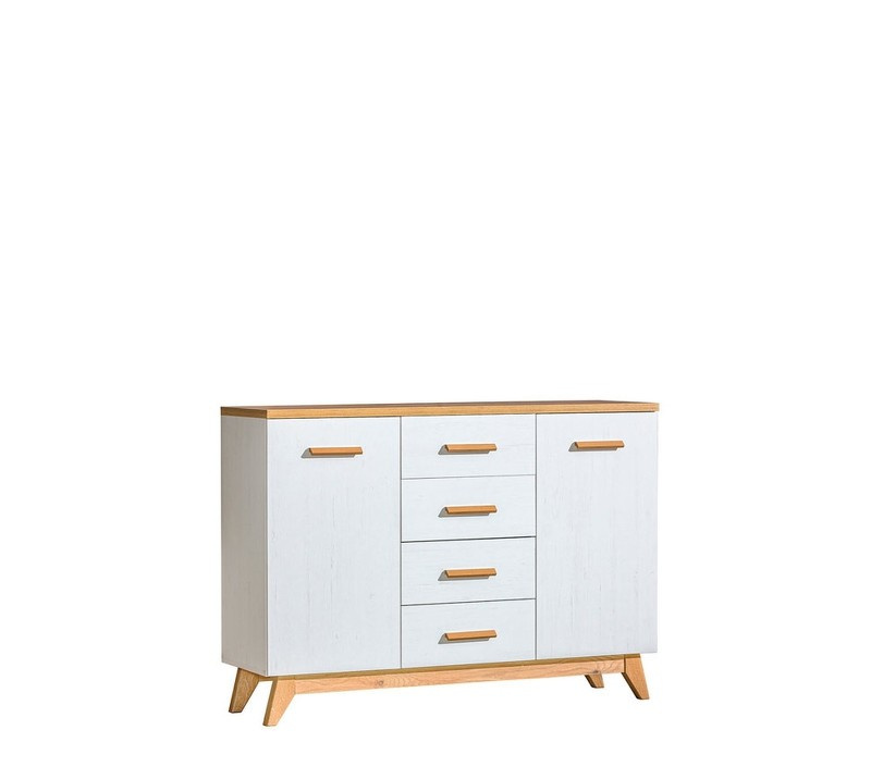 Komoda se dvěma dveřmi, dvěma policemi a čtyřmi zásuvkami.