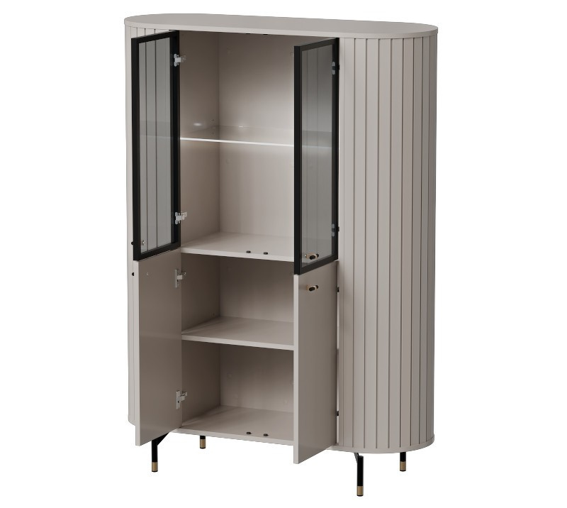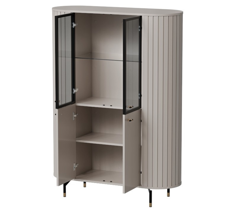 Vitrína je vyrobena z kvalitního lamina a MDF, což zaručuje dlouhou životnost a odolnost. Zaoblené boky z MDF dodávají vitríně jemný a sofistikovaný vzhled, který je podtržen kovovými úchyty a nohami. Zadní část nábytku je vyrobena z desky, což zajišťuje stabilitu a pevnost celé konstrukce.