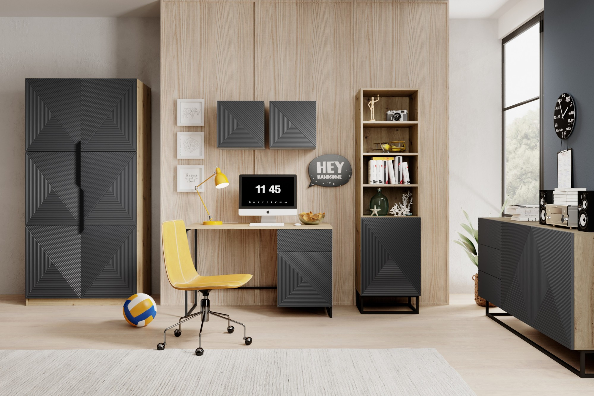 Šatní skříň Asha, dub artisan / rivier stone mat / černé úchyty