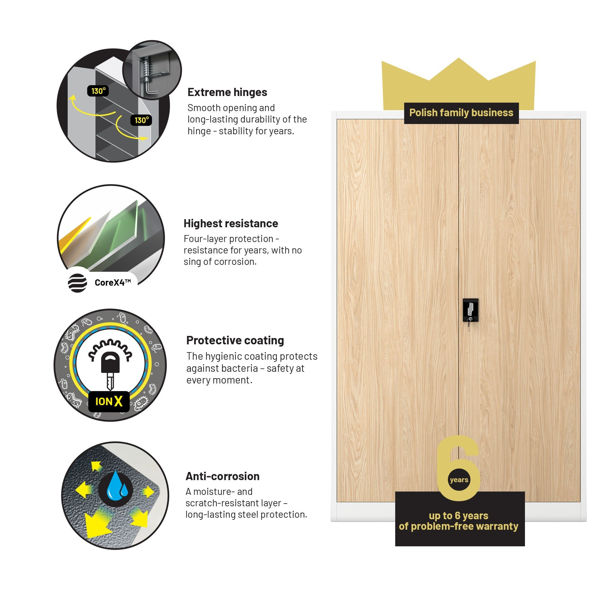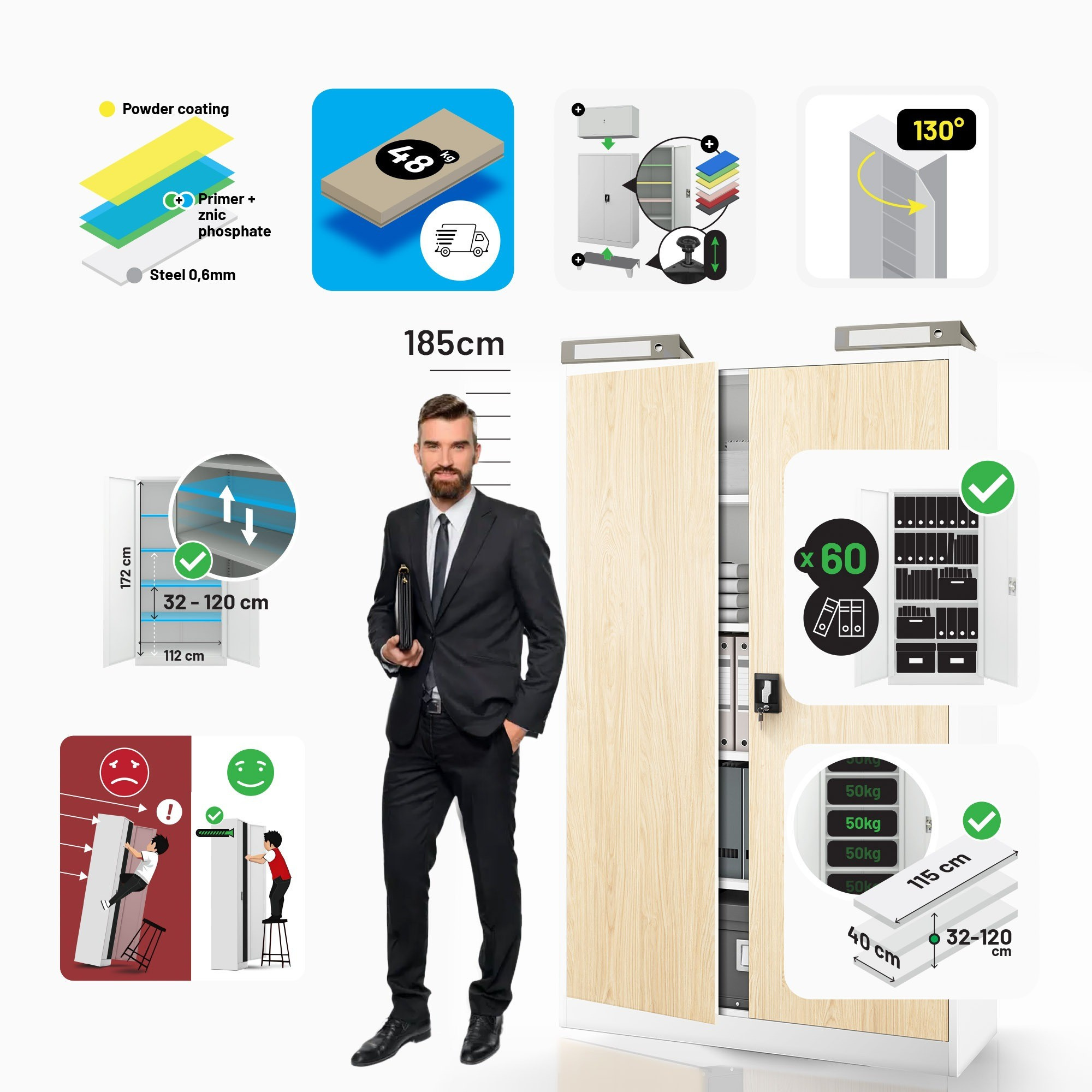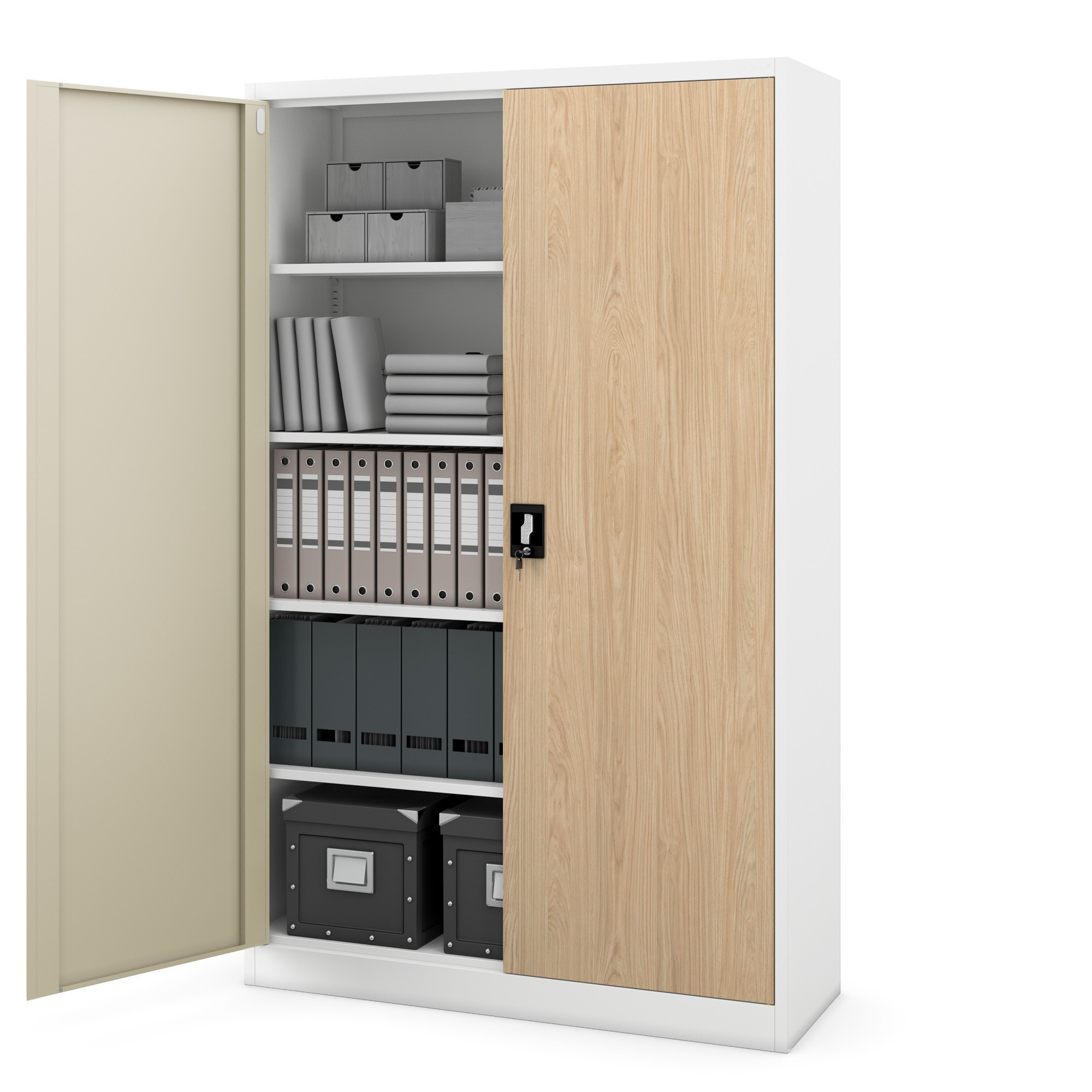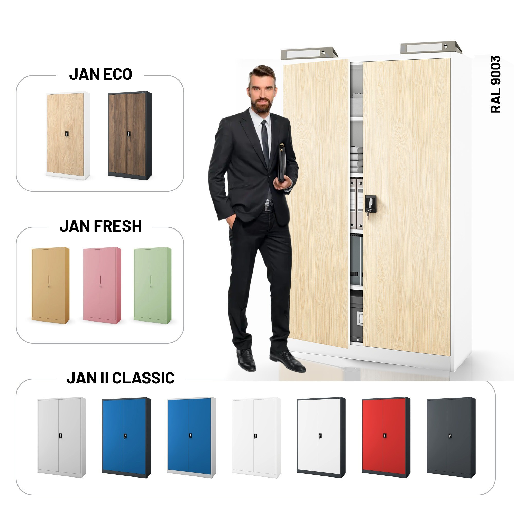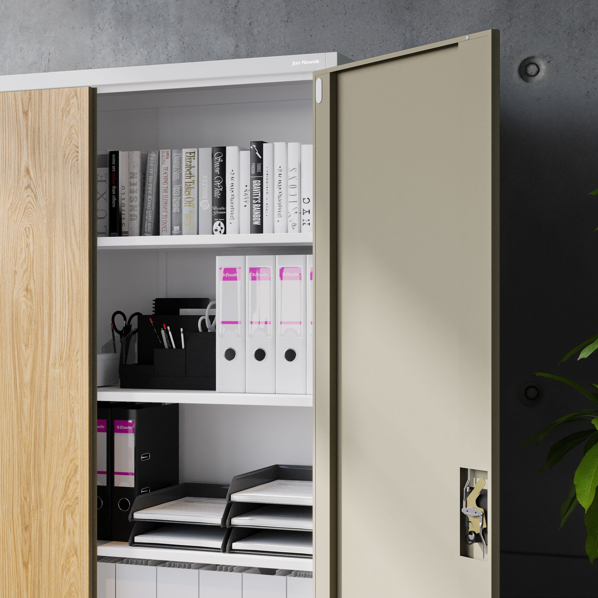 Kancelářská kovová skříň na dokumenty JAN II, Eco Design: bílá/dub sonoma