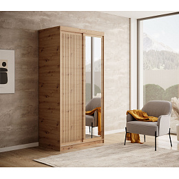 Šatní skříň Delia s posuvnými dveřmi a lamelami v barvách dřeva je stylové a praktické řešení pro ukládání oblečení a dalších předmětů ve vašem domě. Jeho elegantní design v dřevěných barvách dodává interiéru teplo a útulnost, zároveň se hodí k mnoha různým uspořádáním interiéru. Dveře skříně jsou vyrobeny z lamel, což jí dodává lehkost a modernost.