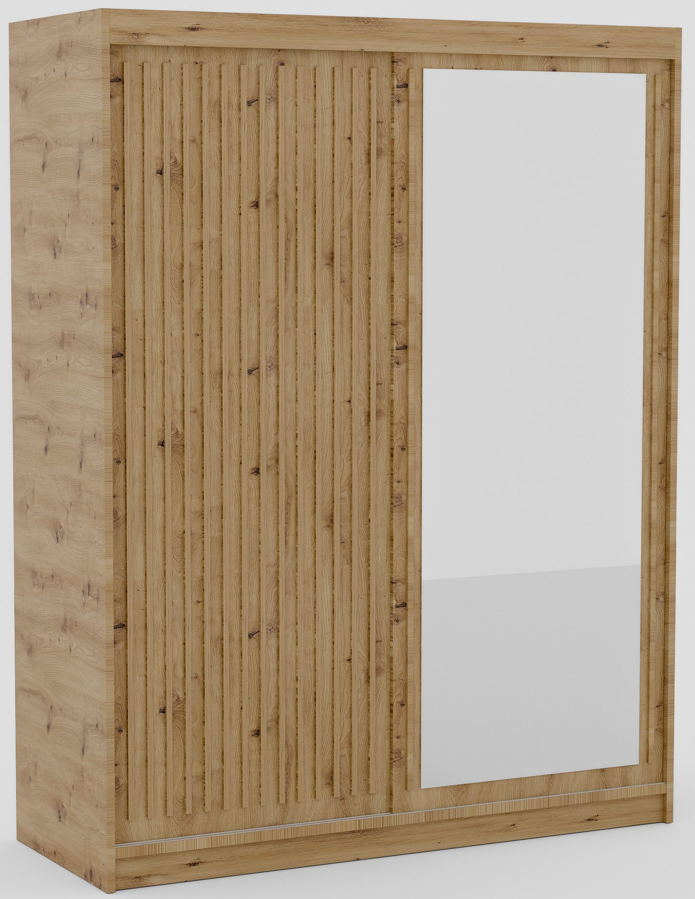 Šatní skříň Delia s posuvnými dveřmi a lamelami v barvách dřeva je stylové a praktické řešení pro ukládání oblečení a dalších předmětů ve vašem domě. Jeho elegantní design v dřevěných barvách dodává interiéru teplo a útulnost, zároveň se hodí k mnoha různým uspořádáním interiéru. Dveře skříně jsou vyrobeny z lamel, což jí dodává lehkost a modernost.
