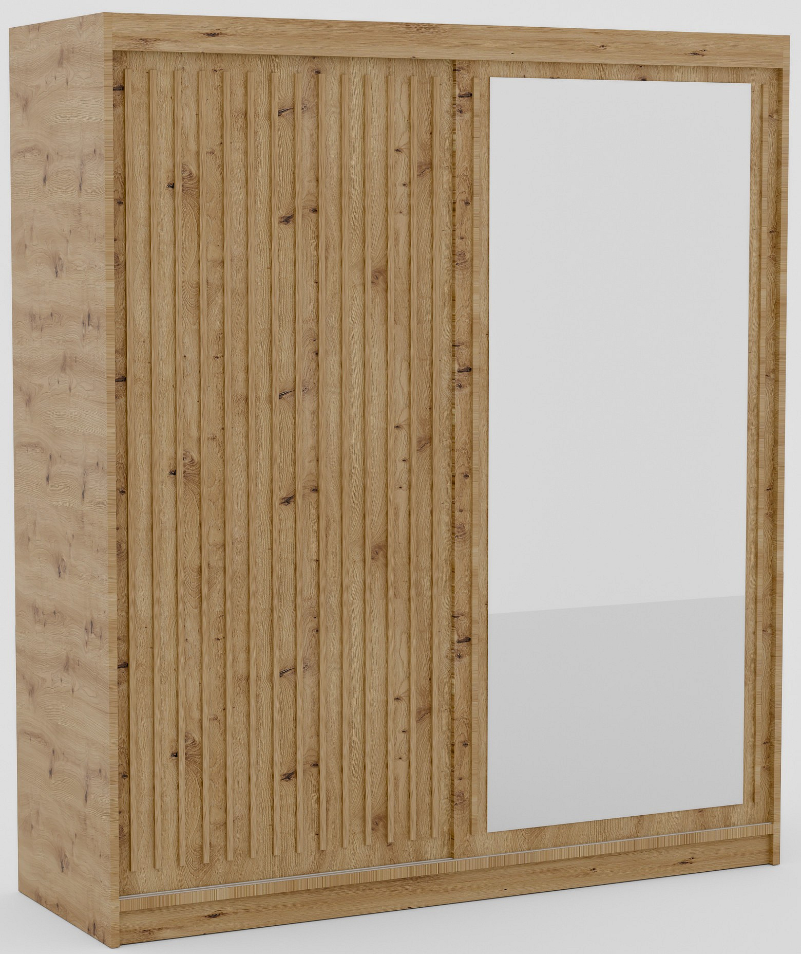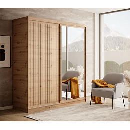 Šatní skříň Delia s posuvnými dveřmi a lamelami v barvách dřeva je stylové a praktické řešení pro ukládání oblečení a dalších předmětů ve vašem domě. Jeho elegantní design v dřevěných barvách dodává interiéru teplo a útulnost, zároveň se hodí k mnoha různým uspořádáním interiéru. Dveře skříně jsou vyrobeny z lamel, což jí dodává lehkost a modernost.
