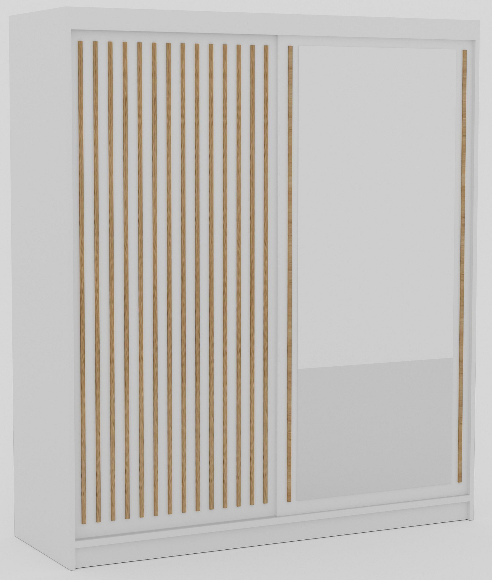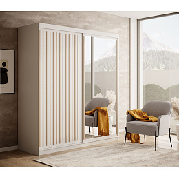 Šatní skříň Delia s posuvnými dveřmi a lamelami v barvách dřeva je stylové a praktické řešení pro ukládání oblečení a dalších předmětů ve vašem domě. Jeho elegantní design v dřevěných barvách dodává interiéru teplo a útulnost, zároveň se hodí k mnoha různým uspořádáním interiéru. Dveře skříně jsou vyrobeny z lamel, což jí dodává lehkost a modernost.