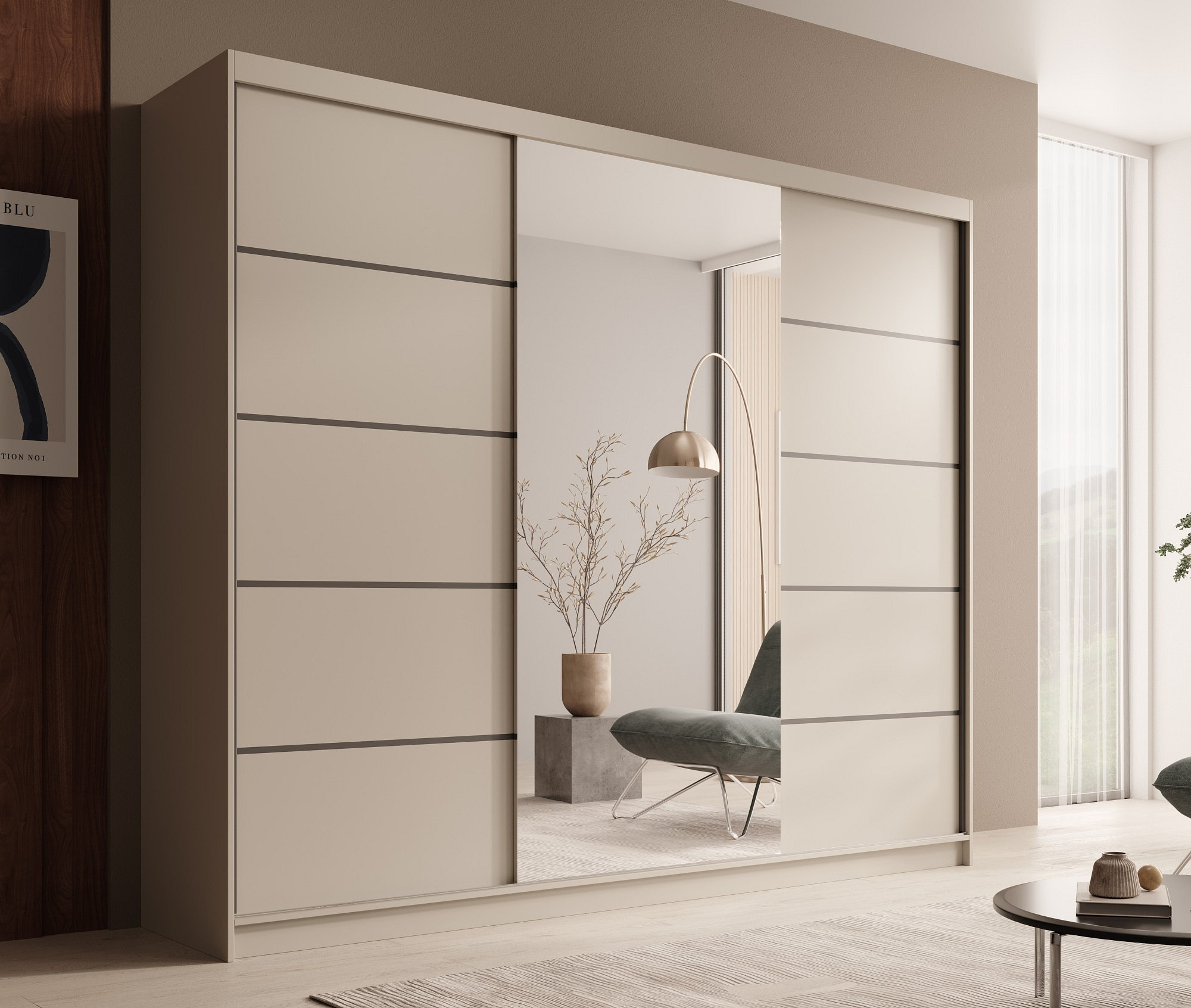 Šatní skříň s posuvnými dveřmi Etna 250 je elegantní a funkční řešení pro každou ložnici nebo šatnu. Jeho moderní design se dokonale hodí k různým stylům interiérů a velké zrcadlo na přední straně opticky zvětšuje prostor a dodává interiéru lehkost. Skříň Etna 250 je ideální kombinací estetiky a funkčnosti, která zajistí pohodlné ukládání a uspořádá váš prostor!