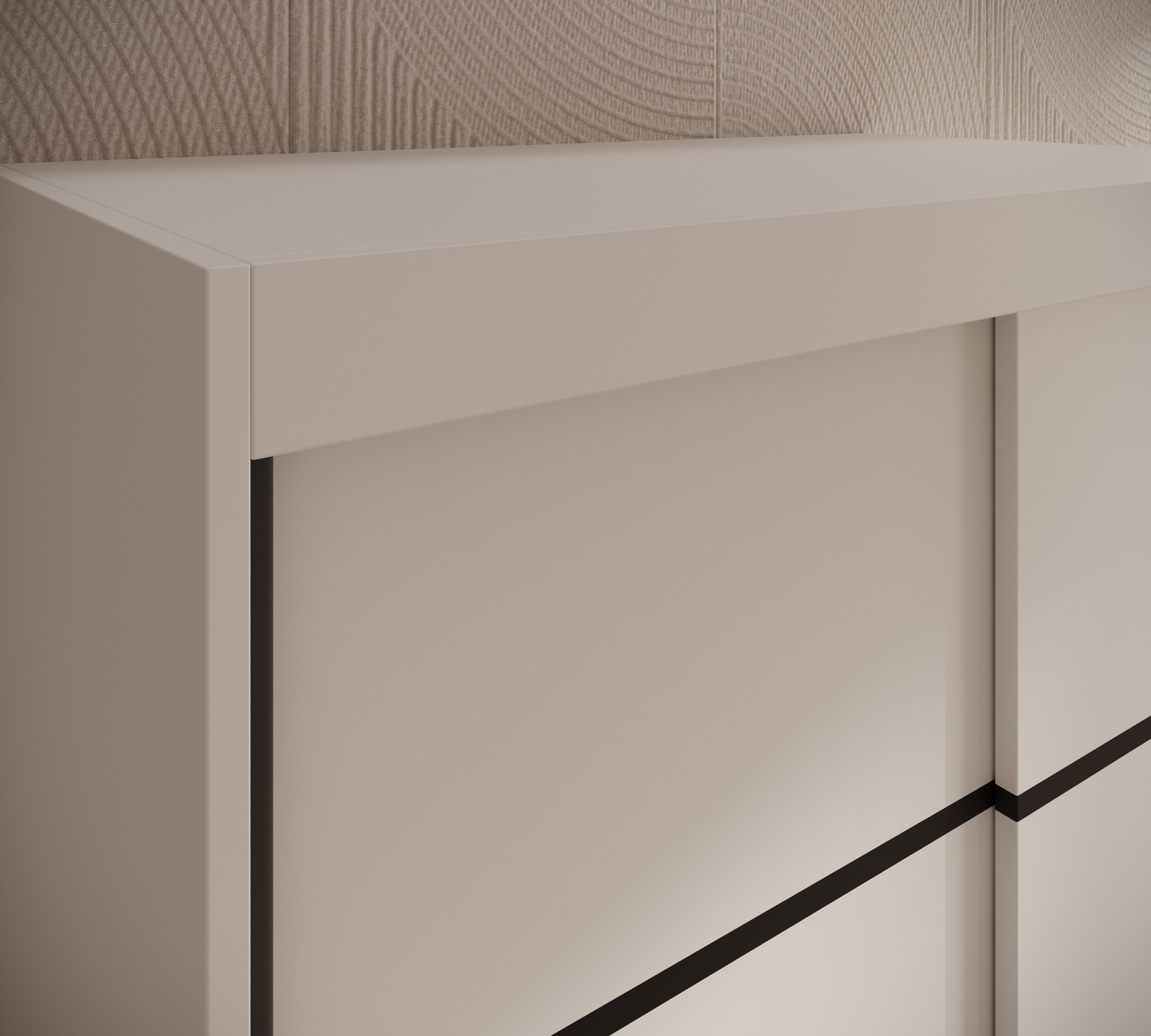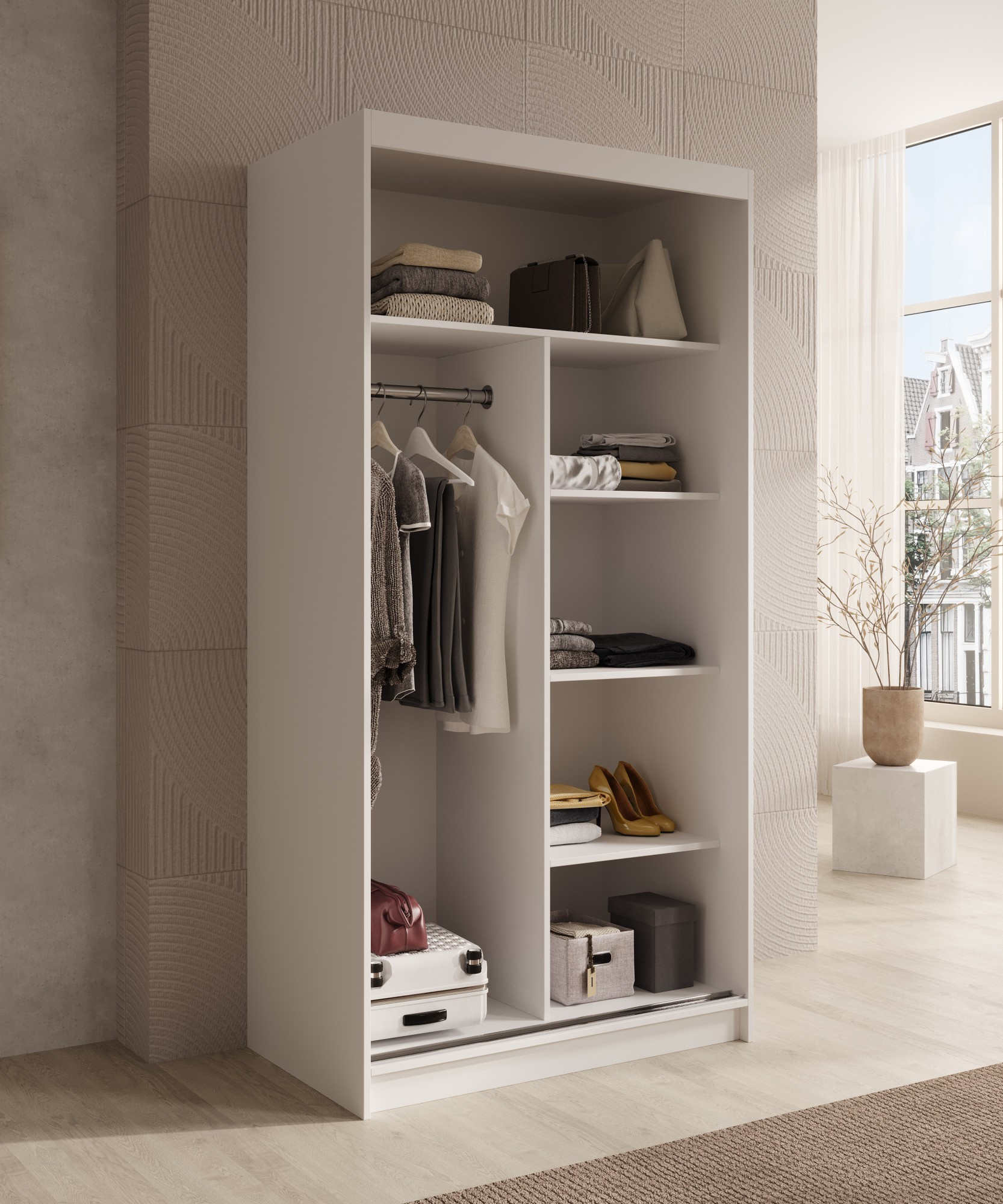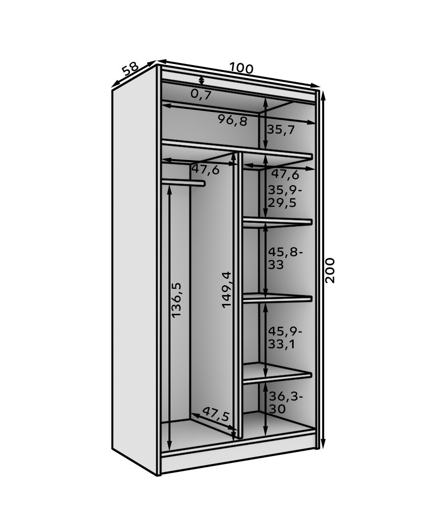 Skříň Verto 100 je funkční a estetický prvek vybavení, který se dokonale hodí do každého interiéru. Vyrobena z laminované desky o tloušťce 16 mm, vyznačuje se odolností proti poškození a snadnou údržbou. Disponuje moderními hliníkovými vodítky, která zajišťují plynulé a tiché posouvání dveří. Díky jednoduchému designu a pevné konstrukci je skříň Verto 100 vynikající volbou do ložnice, předsíně nebo kanceláře, spojující funkčnost s elegantním vzhledem.
