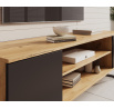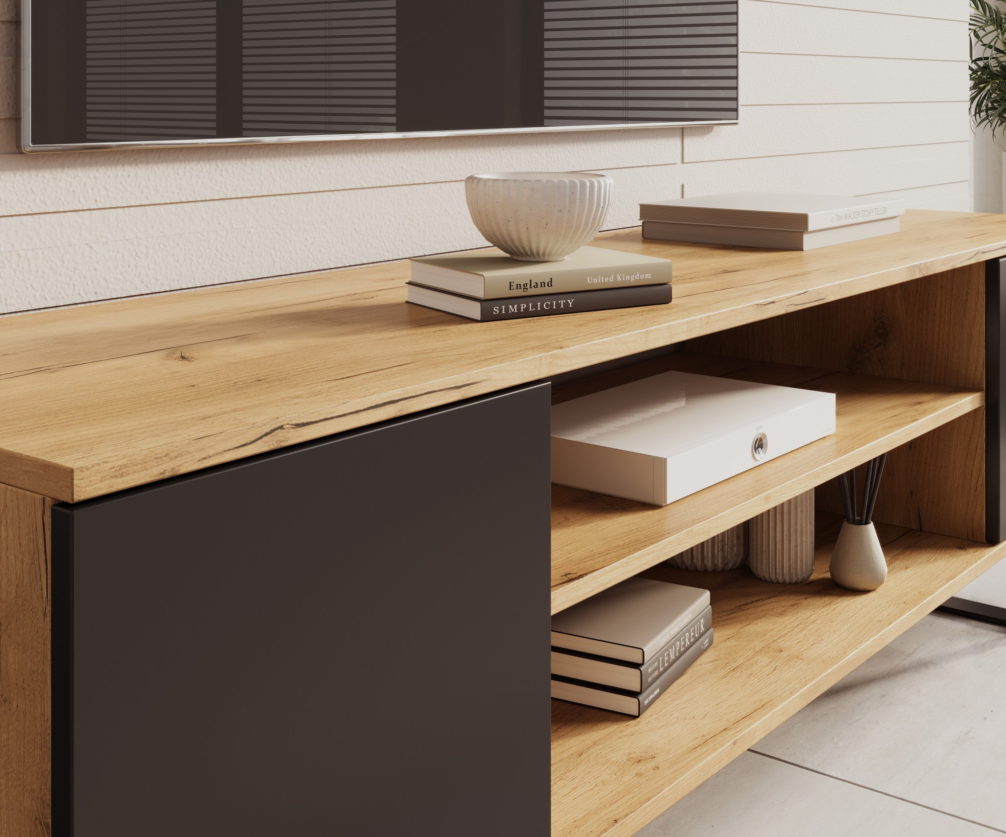 Skříňka RTV Lofter je kombinací moderního stylu s nadčasovou elegancí. Její solidní konstrukce, založená na černých kovových nohách, jí dodává industriální charakter, ideální pro moderní interiéry. Korpus a čela vyrobená v barvě dub craft vnášejí do místnosti teplo a přírodní akcent, skvěle se hodí k různorodým aranžmá.Skříňka nabízí promyšlený úložný prostor: otevřené police ideální pro TV zařízení, dekodéry nebo konzoli a uzavřené skříňky, které pojmou kabely, příslušenství nebo jiné drobnosti. Díky své funkčnosti a estetice Lofter nejen podtrhne charakter obývacího pokoje, ale také usnadní organizaci domácího centra zábavy.To je skvělá volba pro milovníky loftového stylu, kteří si cení praktičnosti a výjimečného designu!
