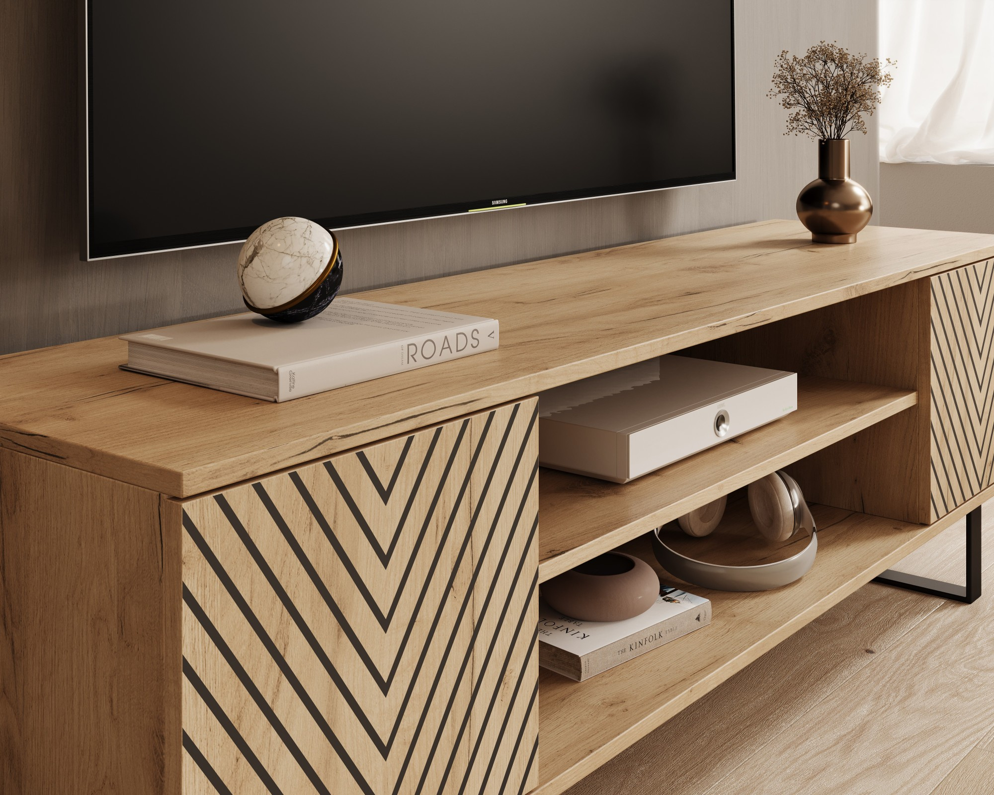 Skříňka RTV Lorello je dokonalým spojením elegance a modernosti, které vnese do vašeho interiéru výjimečný charakter. Čela zdobí jemné motivy lamel a efektní rybí kost, dodávající nábytku jedinečný styl inspirovaný skandinávským a industriálním designem. Černé, kovové nohy podtrhují minimalistickou estetiku, zároveň zajišťují stabilitu a trvanlivost konstrukce. Díky promyšlené organizaci interiéru nabízí skříňka Lorello spoustu místa pro uložení RTV zařízení, příslušenství nebo drobností. Praktické police a zásuvky usnadňují udržování pořádku a otvory na kabely zajišťují, že kabely zůstávají neviditelné. Skříňka RTV Lorello je ideální volbou pro osoby, které si cení funkčnosti, stylu a vysoké kvality zpracování. Skvěle se hodí do obývacích pokojů zařízených v loftovém, moderním nebo klasickém stylu s nádechem elegance.