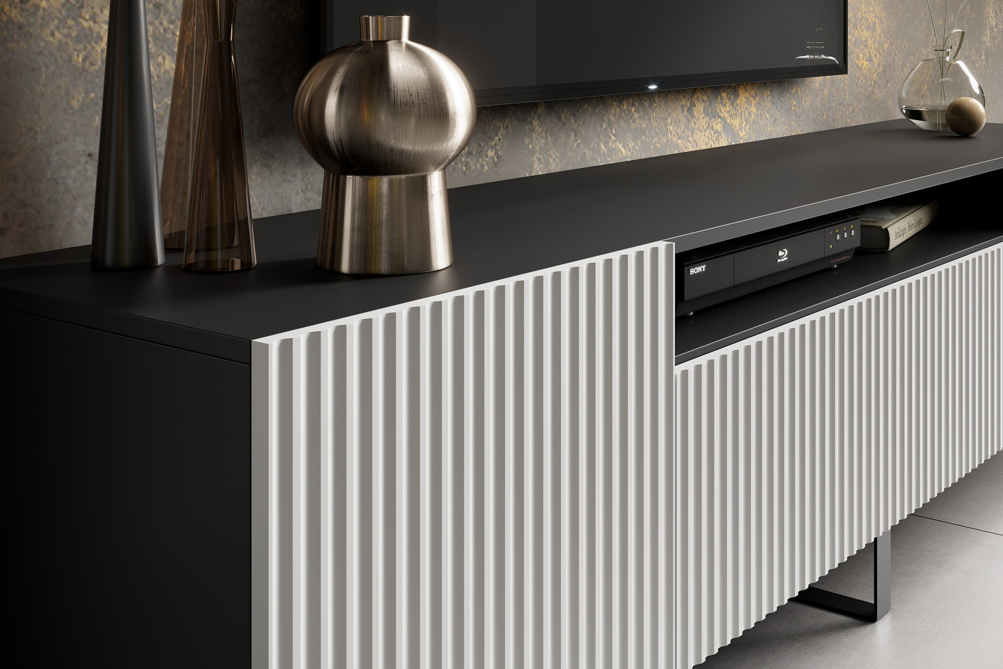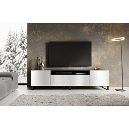 RTV Noemi je moderní, elegantní a funkční televizní skříňka, ideální pro použití v moderních interiérech. Jeho unikátní vlastností je drážkované provedení, které dodává nábytku charakter a texturu. Skříňka byla navržena tak, aby obsahovala vhodné přihrádky a police pro uložení různorodého elektronického vybavení, včetně televize, set-top boxu, herní konzole a mnoha dalších.