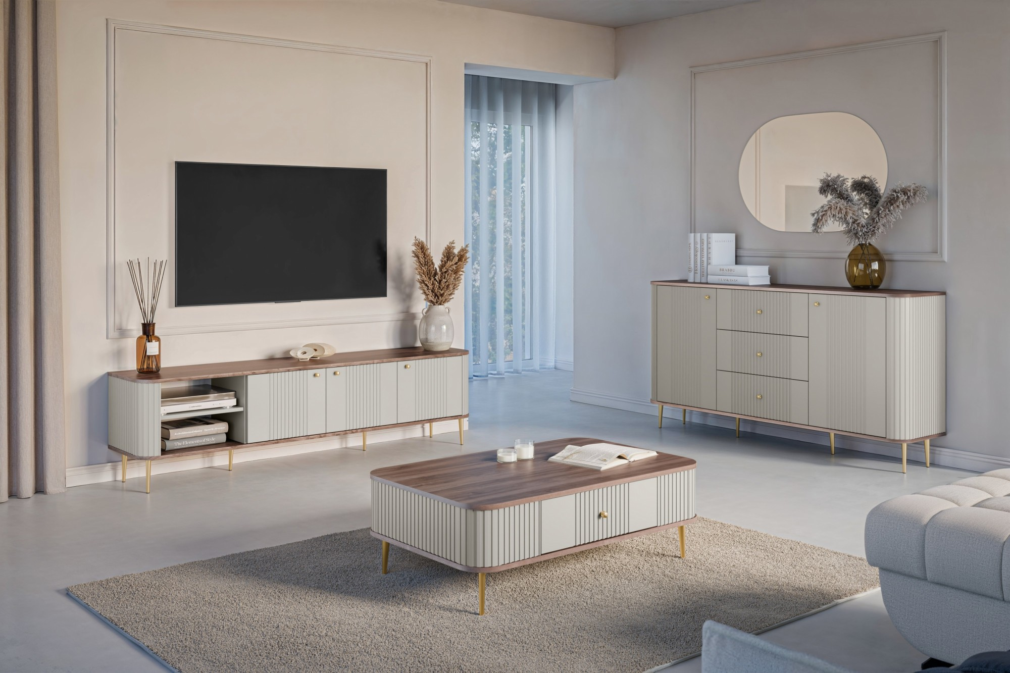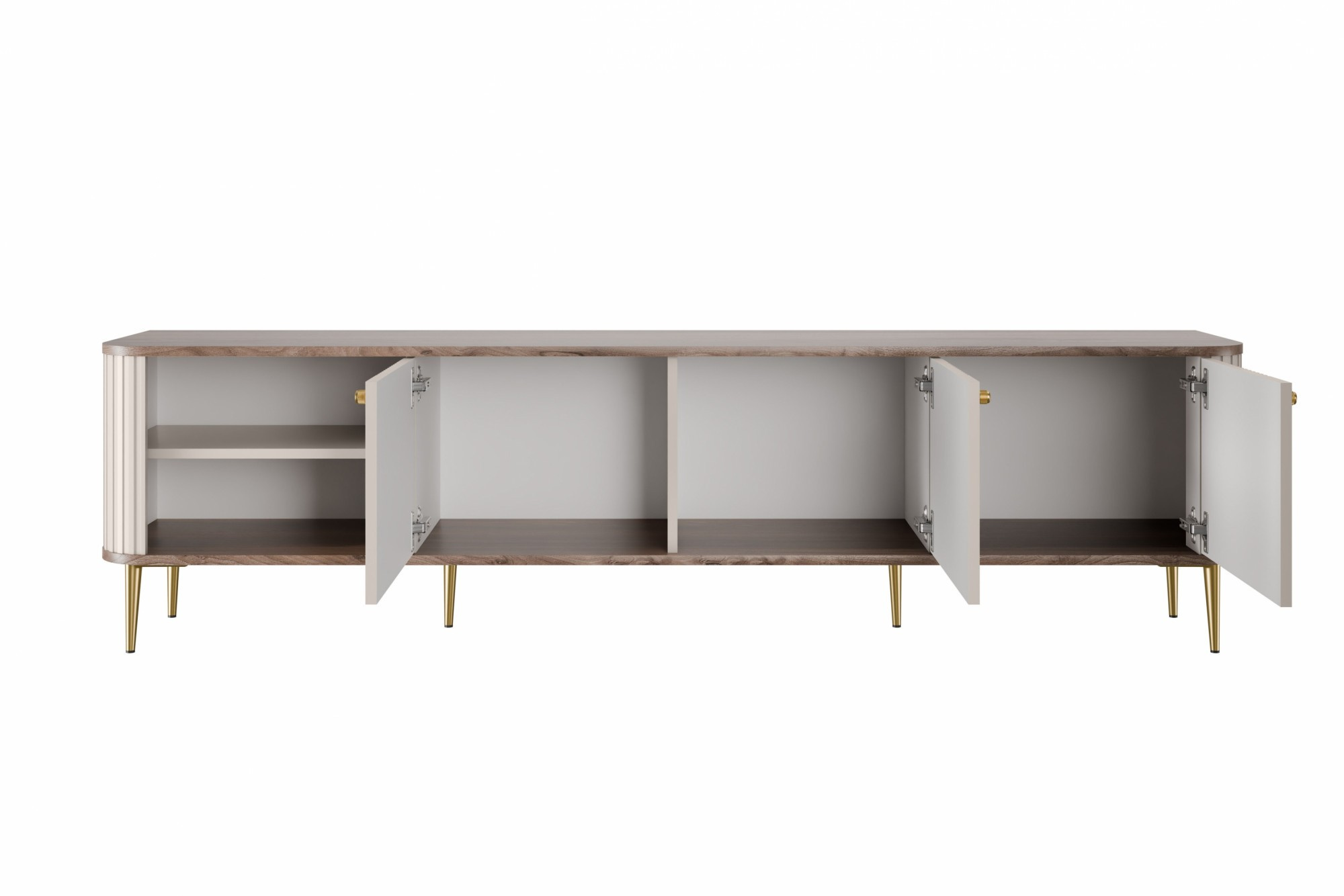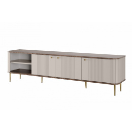 Skříňka RTV Vesper 3D 187 cm - kašmír / ořech / zlaté nohy, Šířka: 187, Výška: 51, Hloubka: 38, Výška nožek: 15, Hloubka desky: , Montáž: