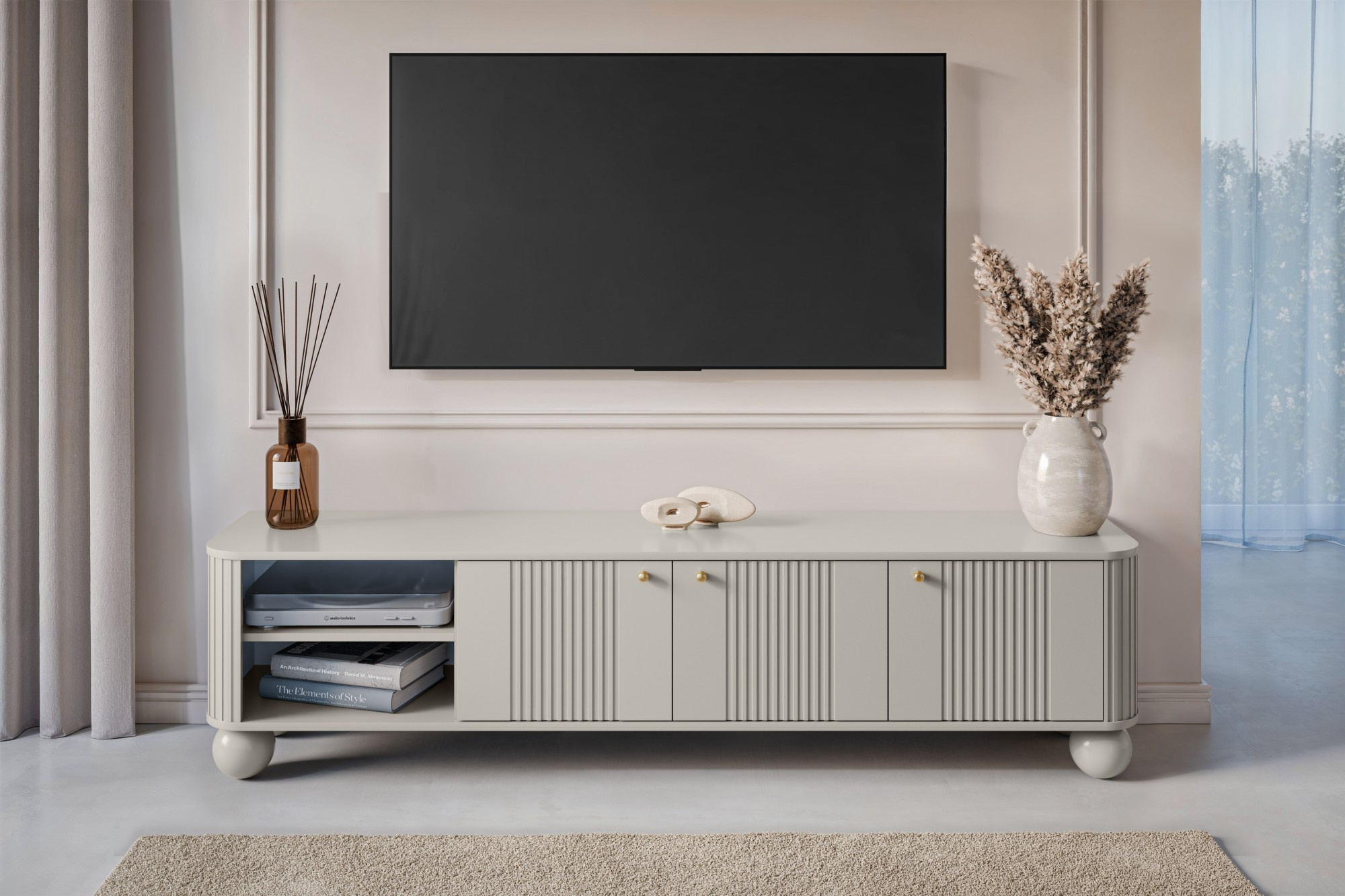 TV skříňka Vesper 3D 187 cm - kašmír / zlaté úchyty / nohy koule, Šířka: 187, Výška: 48, Hloubka: 38, Výška nožek: 12, Hloubka desky: , Montáž: