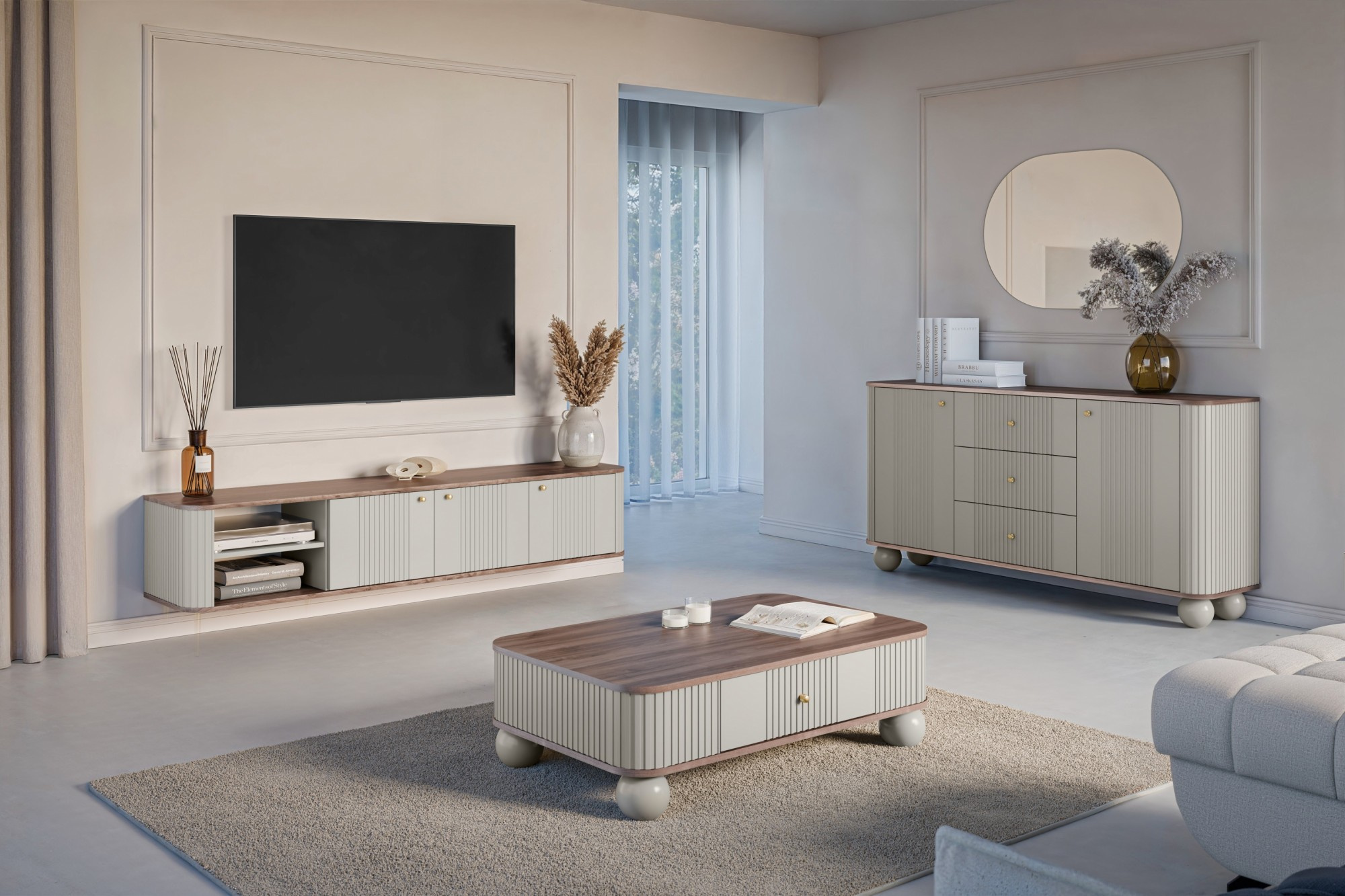 Závěsná TV komoda Vesper 3D, kašmír / ořech / zlaté úchyty
