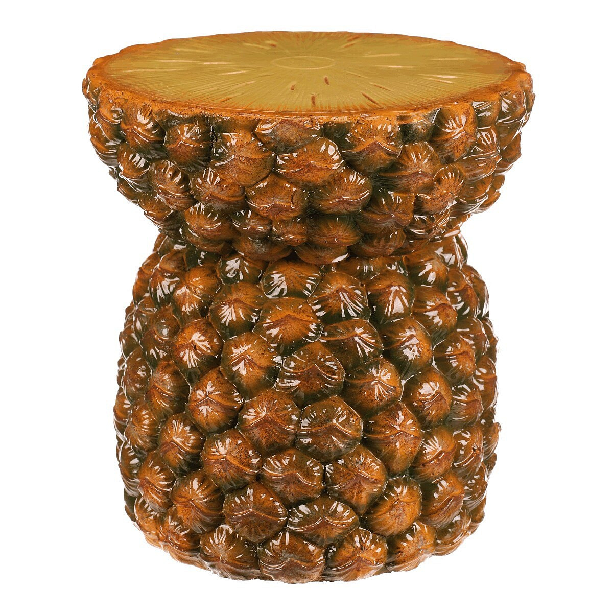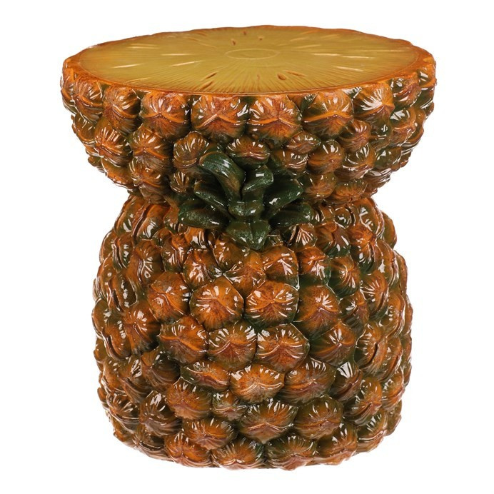 Taburet ve tvaru ananasu je vyroben z magnesia s povrchovou úpravou v žluto-oranžových odstínech, která věrně imituje strukturu a barvu skutečného ovoce. Jeho detailně propracovaná silueta s výraznými listy vytváří dekorativní prvek vhodný do interiérů s tropickým nebo hravým stylem. Kompaktní rozměry a stabilní základna umožňují využití jako sedátko nebo odkládací plocha. Povrch se snadno udržuje a díky pevnému základu je zajištěna dlouhá životnost produktu. Taburet je ideální pro oživení prostoru a dodání originálního akcentu.