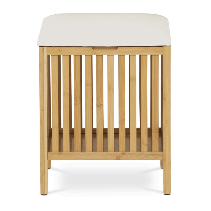 Taburet z masivního bambusu v přírodním odstínu kombinuje praktický úložný prostor s možností sezení díky polstrovanému sedáku v jemné bílé barvě. Bambusové lamely tvoří pevnou a vzdušnou základnu, která umožňuje cirkulaci vzduchu uvnitř koše. Polstrovaný sedák je potažený látkou, která se snadno udržuje a zvyšuje komfort při sezení. Díky svému přírodnímu vzhledu se hodí do různých interiérů, kde přináší přírodní atmosféru a funkčnost v jednom.