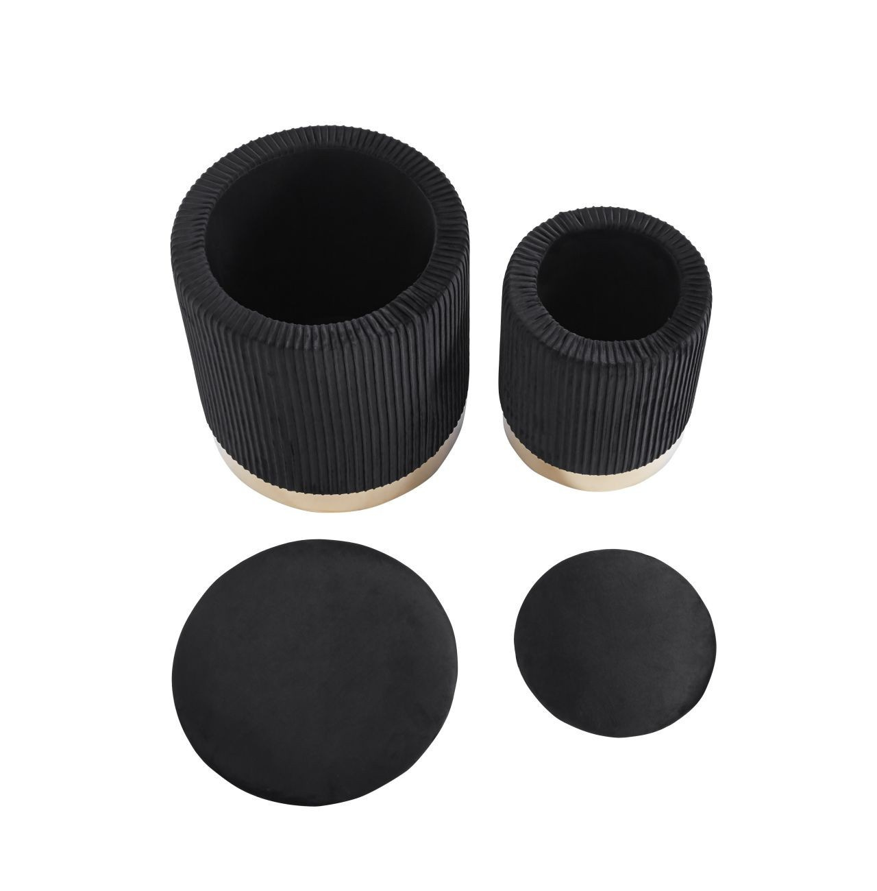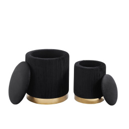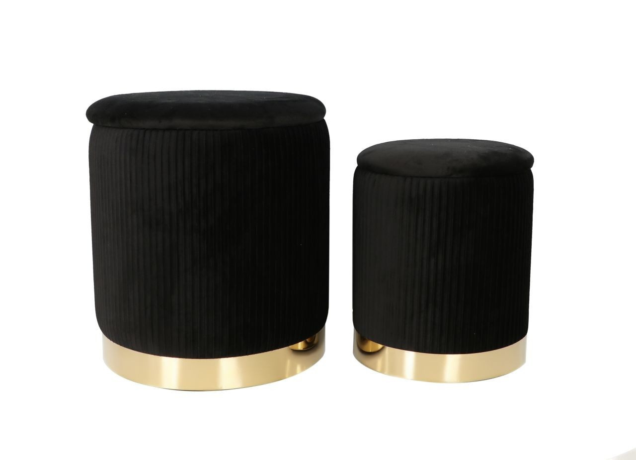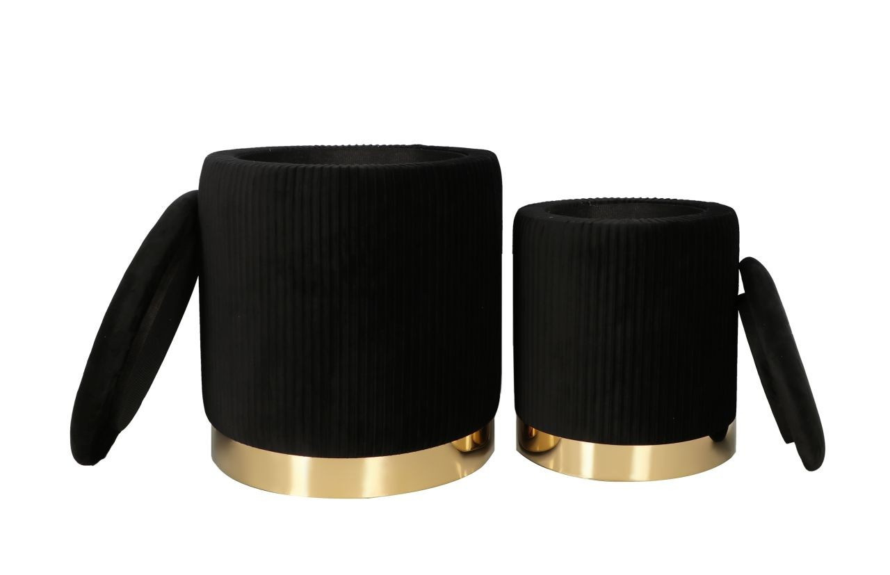 Rozměry: *puf větší: - průměr 36 cm - výška: 42 cm *puf menší: - průměr 28 cm - výška: 36 cm Materiál: - látka samet + chromovaný kov Ostatní: - funkce úložného prostoru Barva: - látka: černá - základna: zlatá