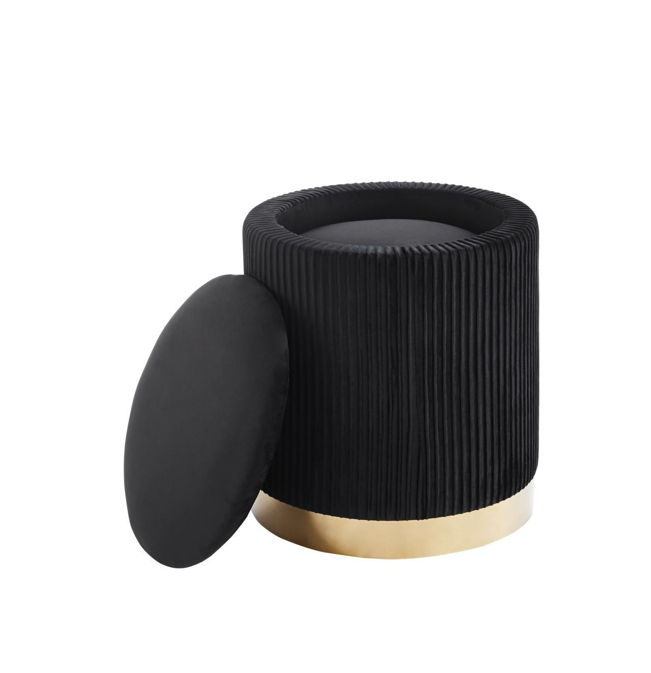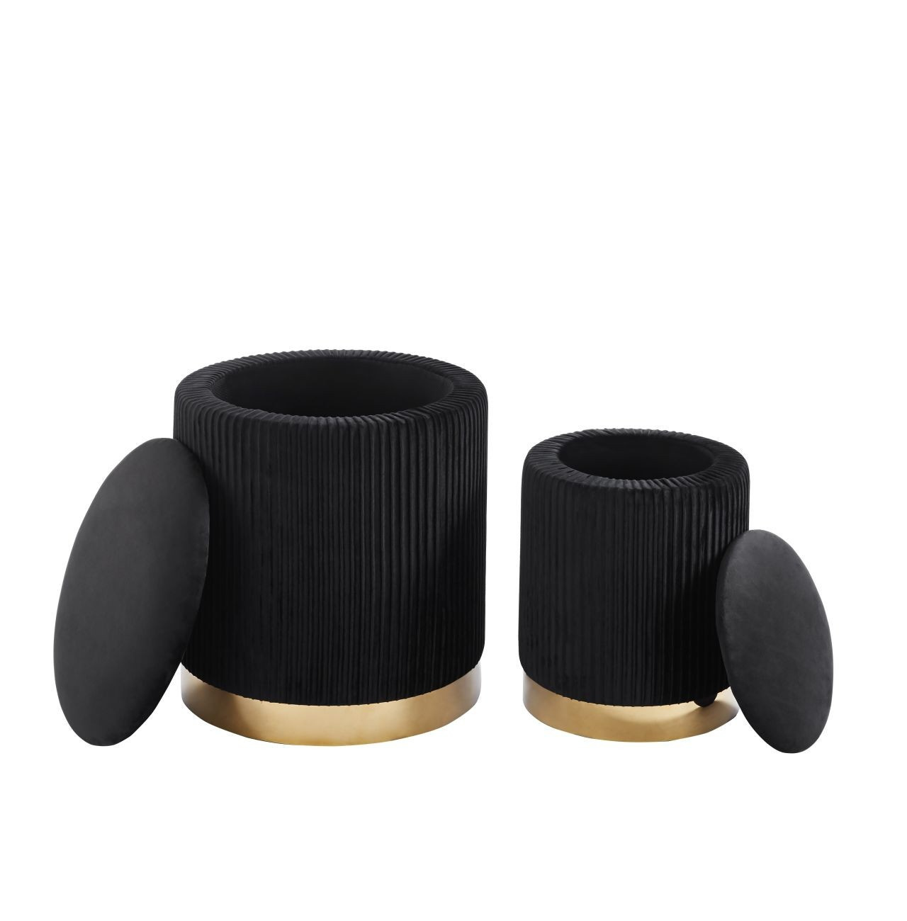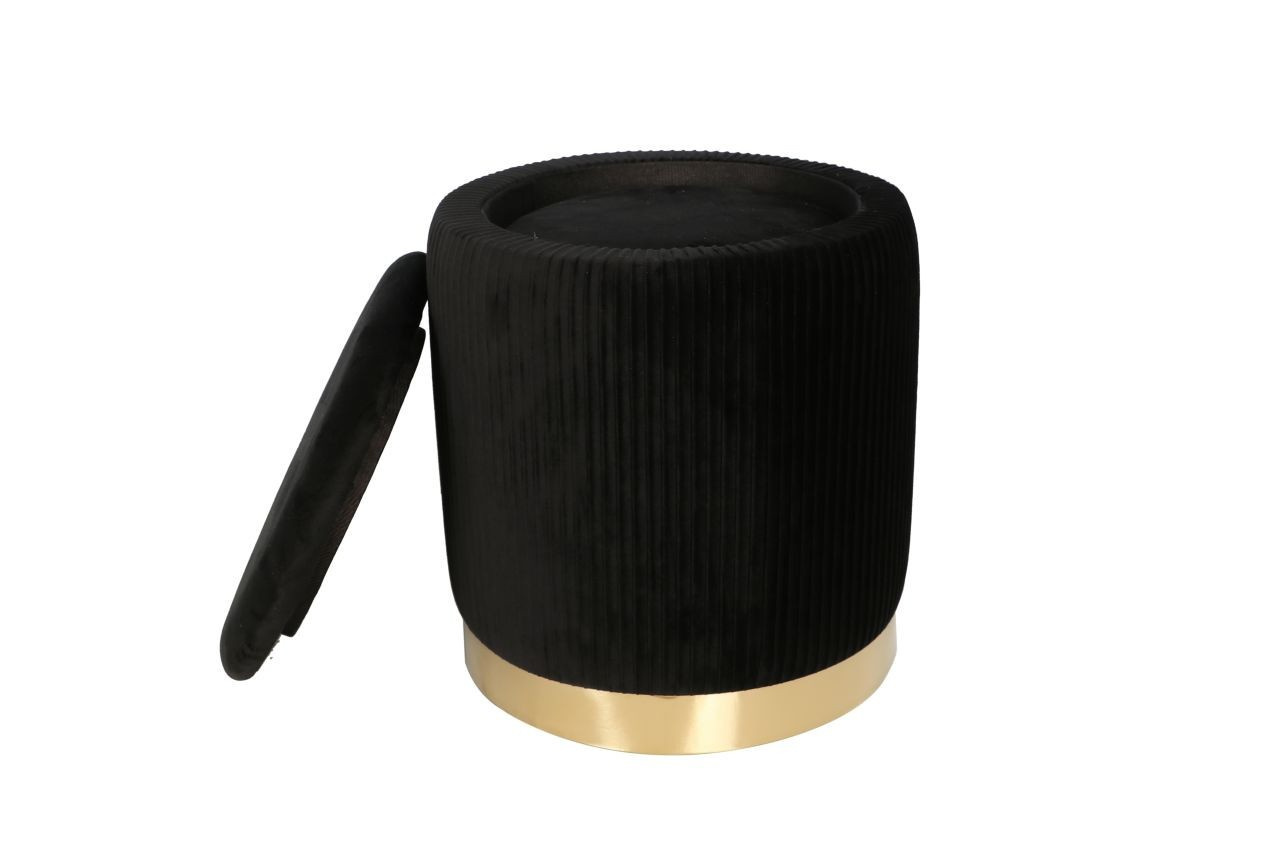 Rozměry: *puf větší: - průměr 36 cm - výška: 42 cm *puf menší: - průměr 28 cm - výška: 36 cm Materiál: - látka samet + chromovaný kov Ostatní: - funkce úložného prostoru Barva: - látka: černá - základna: zlatá