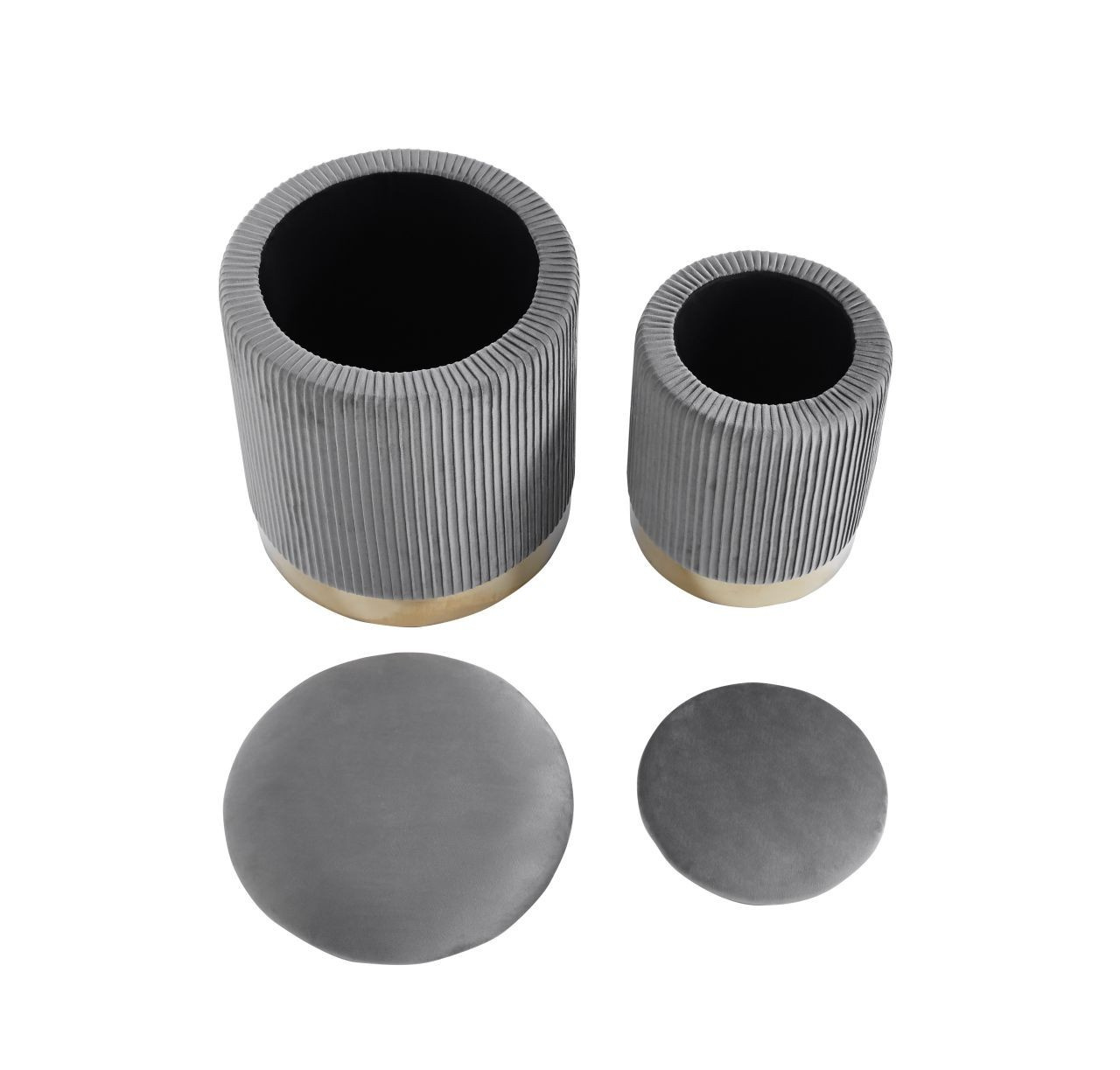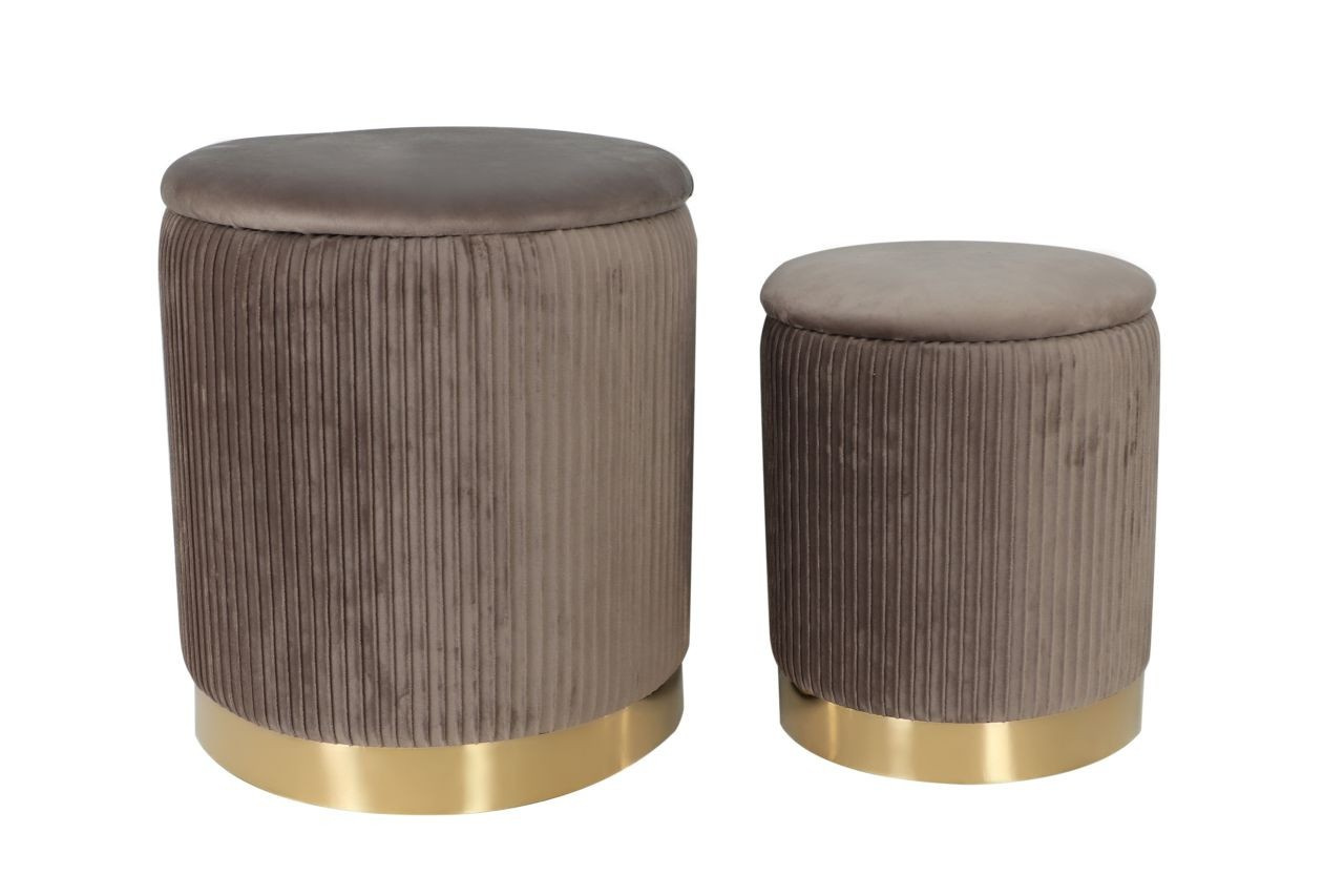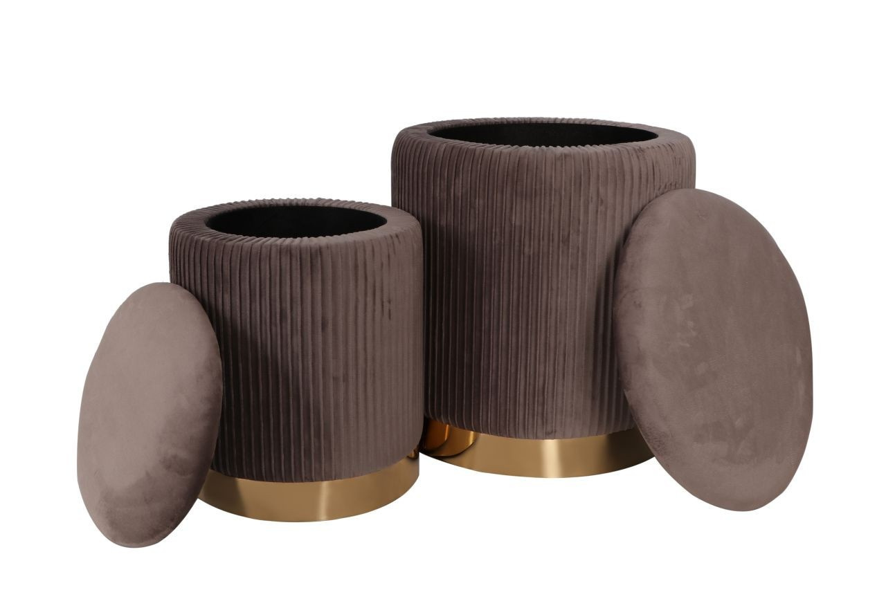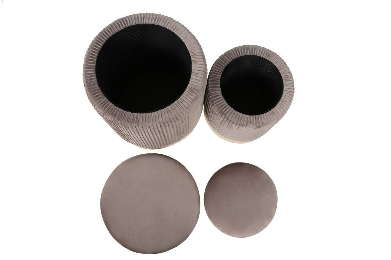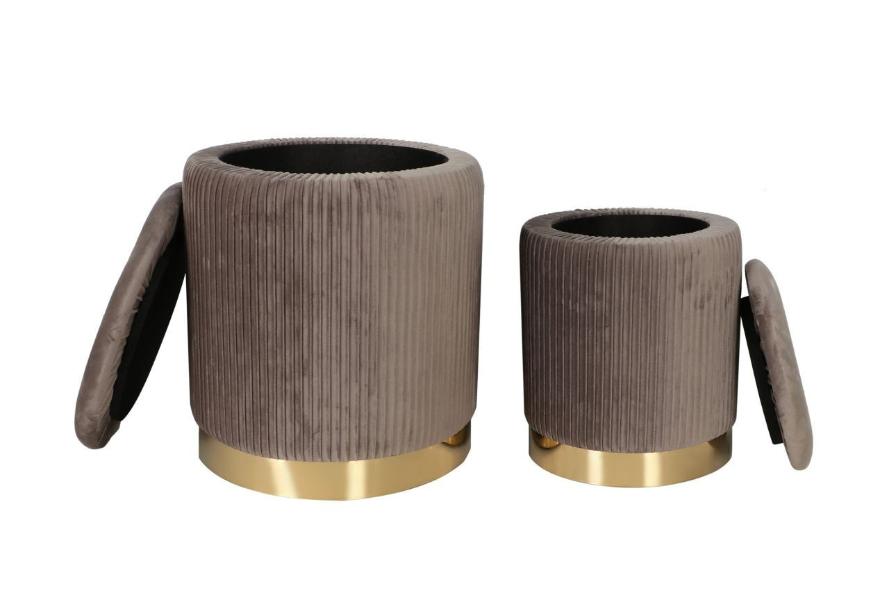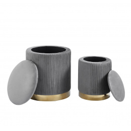 Rozměry: *puf větší: - průměr 36 cm - výška: 42 cm *puf menší: - průměr 28 cm - výška: 36 cm Materiál: - látka velvet + chromovaný kov Ostatní: - funkce úložného prostoru Barva: - látka: šedá - základna: zlatá