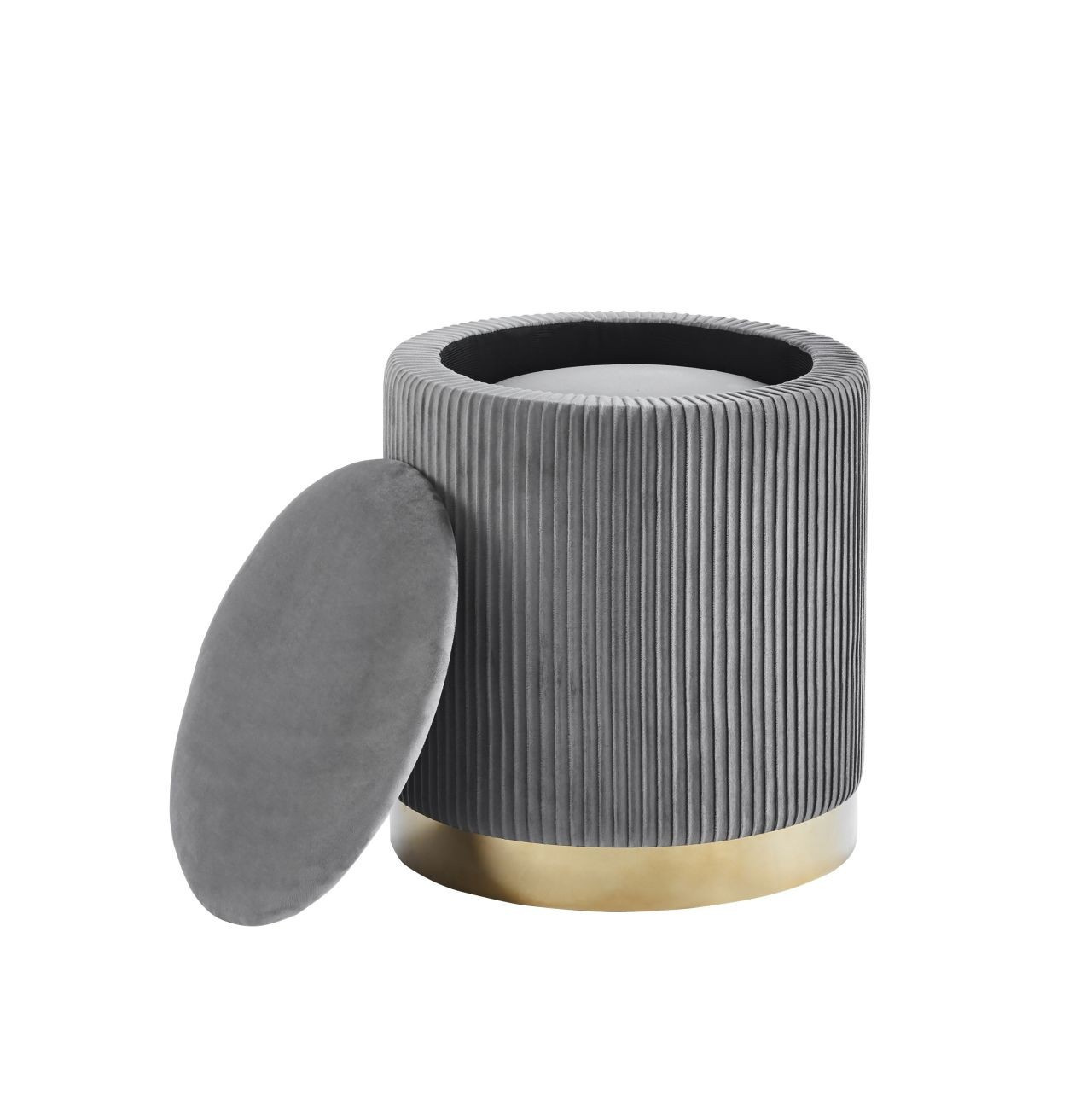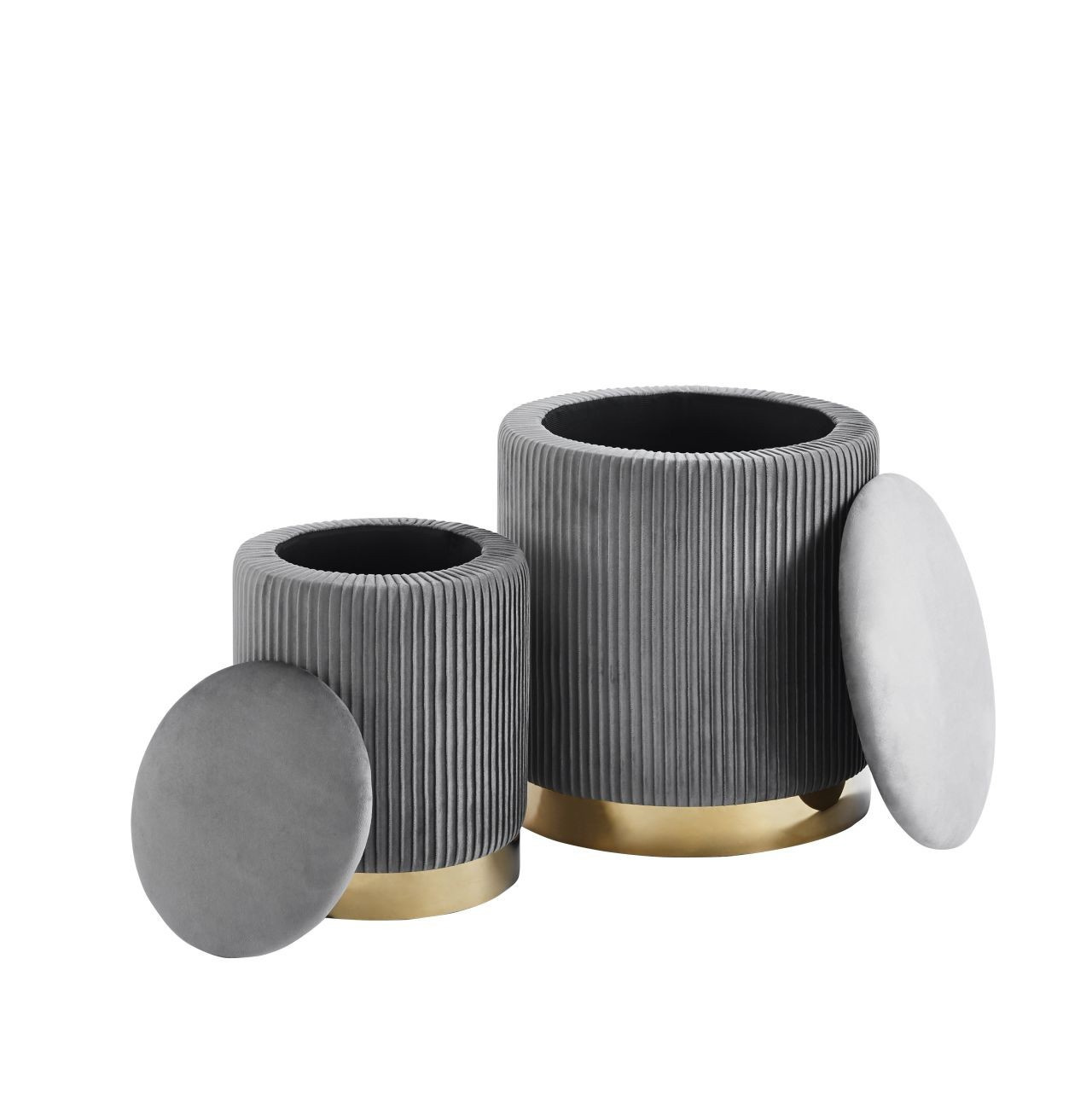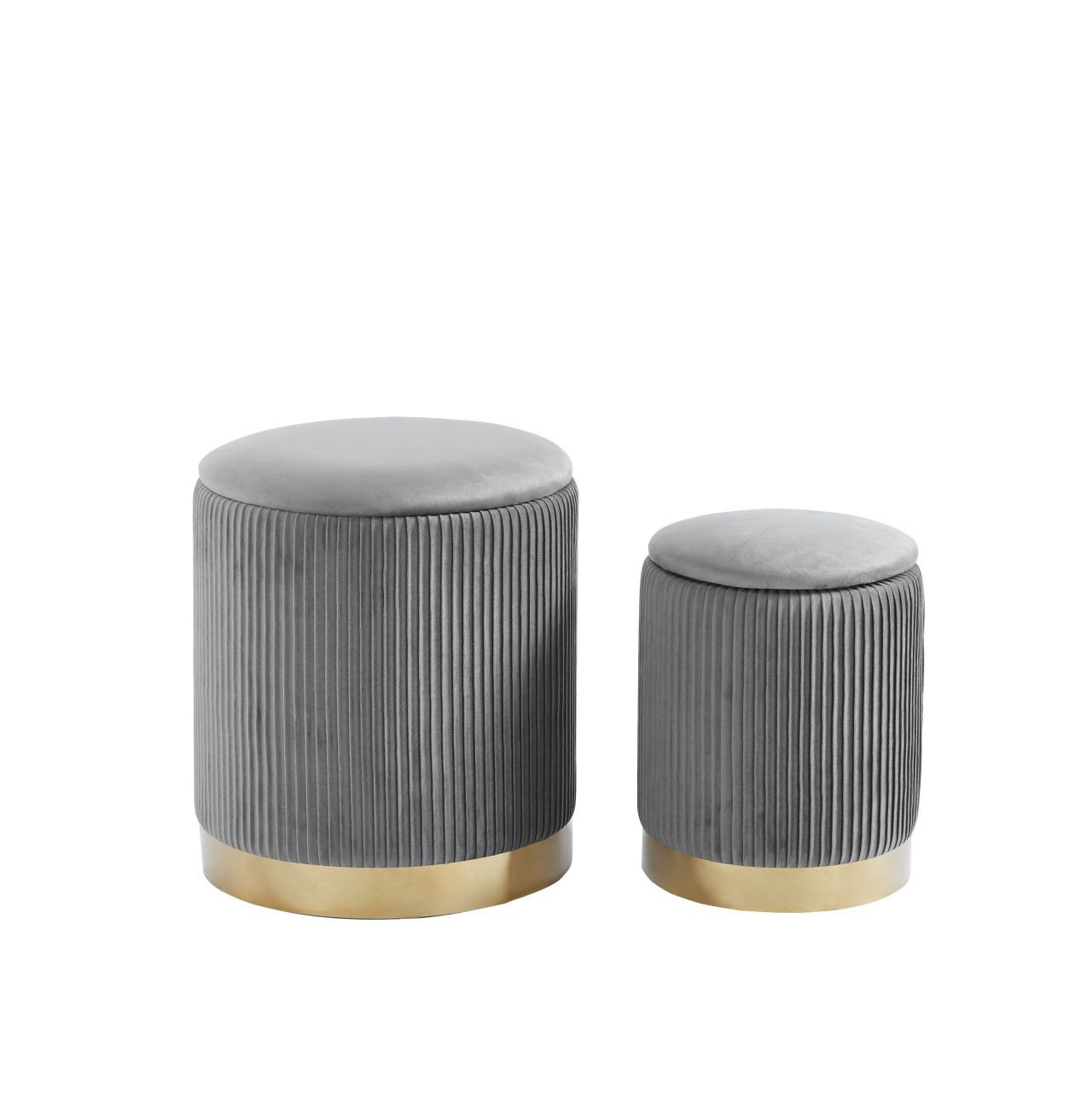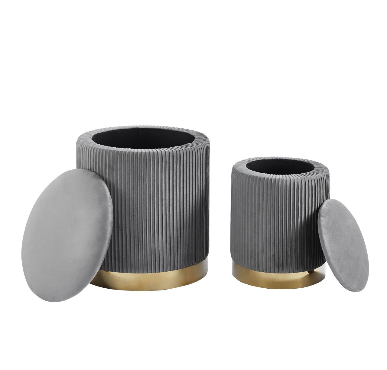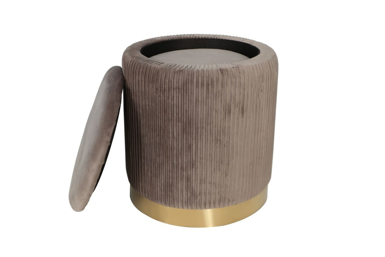 Rozměry: *puf větší: - průměr 36 cm - výška: 42 cm *puf menší: - průměr 28 cm - výška: 36 cm Materiál: - látka velvet + chromovaný kov Ostatní: - funkce úložného prostoru Barva: - látka: šedá - základna: zlatá