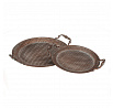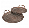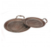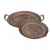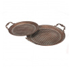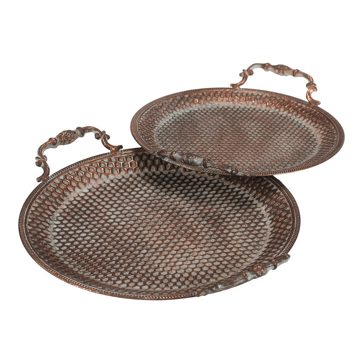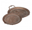 Sada dvou aranžovacích táců v měděném provedení z kovu nabízí praktické a dekorativní řešení pro servírování či vystavení drobných předmětů. Povrch táců zdobí reliéfní vzor připomínající včelí plástve, který dodává celku zajímavý vizuální efekt. Každý tác je opatřen dvěma zdobenými úchyty pro snadnou manipulaci a přenášení. Vyniknou samostatně i jako součást stolní dekorace v rustikálním či vintage stylu interiéru.