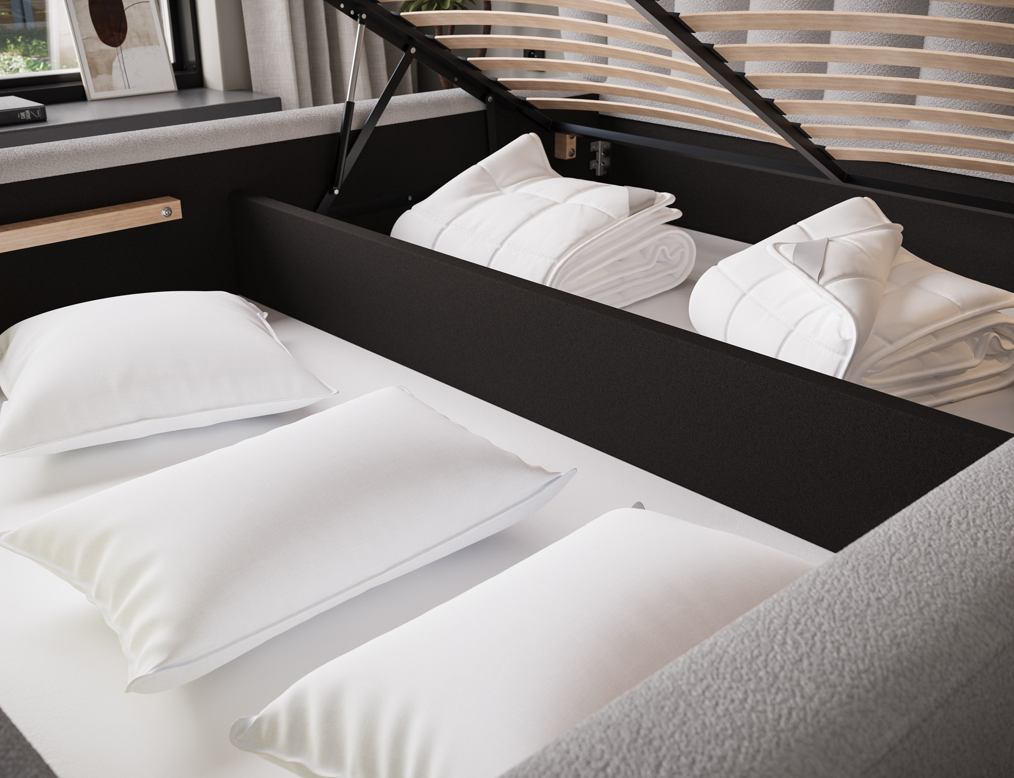 Postel do ložnice Tapedo kombinuje moderní design, funkčnost a pohodlí při spaní. Dostupné ve třech velikostních variantách: 140x200 cm, 160x200 cm a 180x200 cm, umožňuje přizpůsobit šířku vašim individuálním potřebám – 165 cm, 185 cm nebo 205 cm. Celková výška postele je 131 cm a hloubka je 221 cm, což konstrukci dodává elegantní a vyvážený vzhled. Výplň z vysoce kvalitní polyuretanové pěny T2130 zajišťuje optimální podporu těla a vynikající pohodlí. Postel Tapedo je vybavena praktickým úložným prostorem na lůžkoviny, který usnadňuje udržování pořádku ve vaší ložnici. Stabilní černé plastové nohy dodávají designu lehkost a moderní nádech. Díky své solidní řemeslné práci, funkčním vlastnostem a estetické formě, postel Tapedo dokonale doplňuje moderní interiérové uspořádání, čímž vytváří elegantní a útulný prostor pro odpočinek.