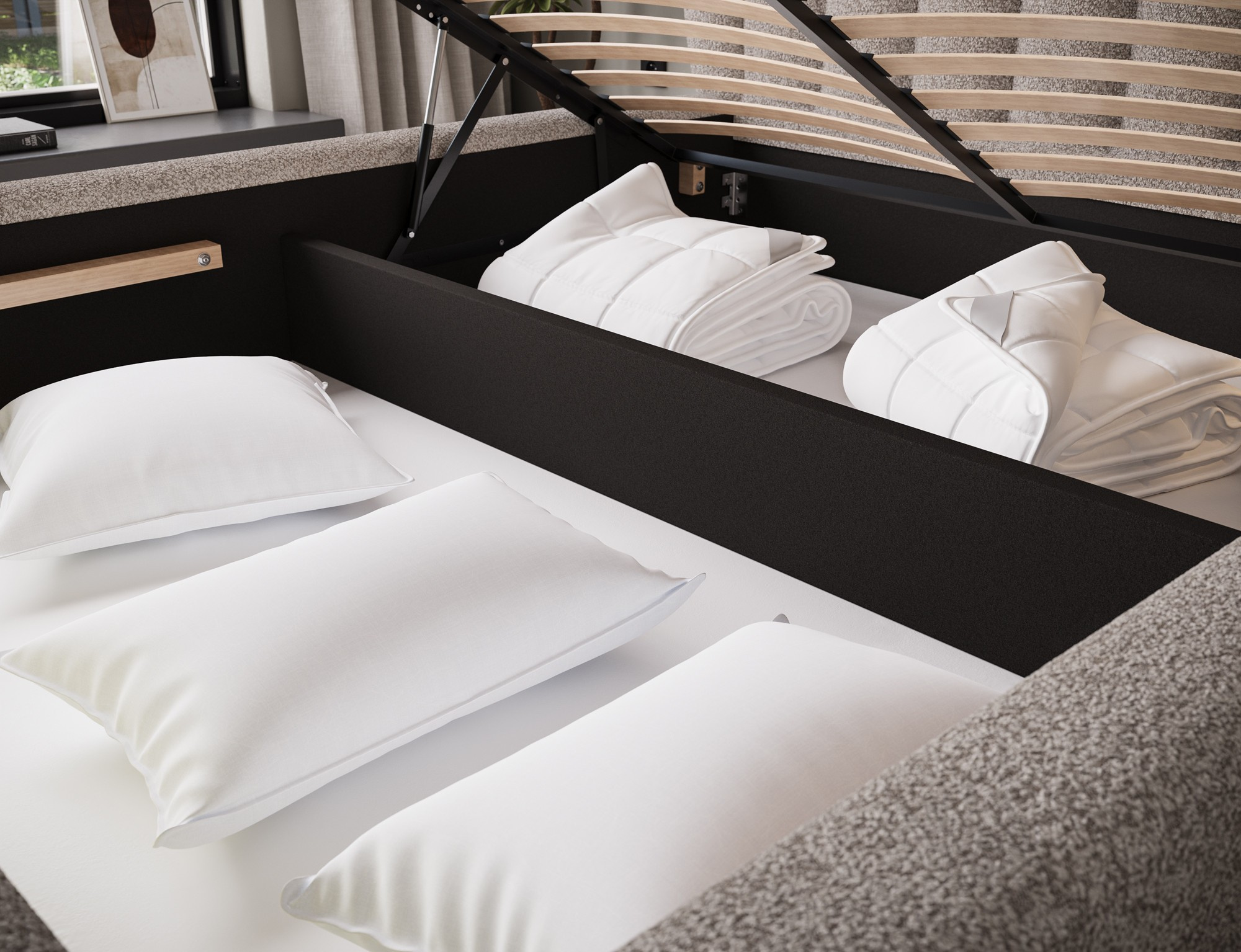 Postel do ložnice Tapedo kombinuje moderní design, funkčnost a pohodlí při spaní. Dostupné ve třech velikostních variantách: 140x200 cm, 160x200 cm a 180x200 cm, umožňuje přizpůsobit šířku vašim individuálním potřebám – 165 cm, 185 cm nebo 205 cm. Celková výška postele je 131 cm a hloubka je 221 cm, což konstrukci dodává elegantní a vyvážený vzhled. Výplň z vysoce kvalitní polyuretanové pěny T2130 zajišťuje optimální podporu těla a vynikající pohodlí. Postel Tapedo je vybavena praktickým úložným prostorem na lůžkoviny, který usnadňuje udržování pořádku ve vaší ložnici. Stabilní černé plastové nohy dodávají designu lehkost a moderní nádech. Díky své solidní řemeslné práci, funkčním vlastnostem a estetické formě, postel Tapedo dokonale doplňuje moderní interiérové uspořádání, čímž vytváří elegantní a útulný prostor pro odpočinek.
