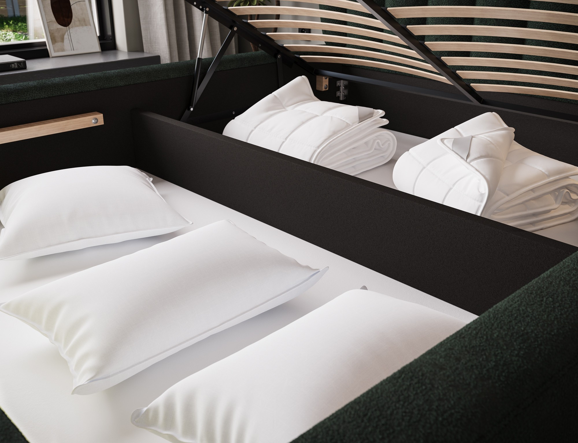 Postel do ložnice Tapedo kombinuje moderní design, funkčnost a pohodlí při spaní. Dostupné ve třech velikostních variantách: 140x200 cm, 160x200 cm a 180x200 cm, umožňuje přizpůsobit šířku vašim individuálním potřebám – 165 cm, 185 cm nebo 205 cm. Celková výška postele je 131 cm a hloubka je 221 cm, což konstrukci dodává elegantní a vyvážený vzhled. Výplň z vysoce kvalitní polyuretanové pěny T2130 zajišťuje optimální podporu těla a vynikající pohodlí. Postel Tapedo je vybavena praktickým úložným prostorem na lůžkoviny, který usnadňuje udržování pořádku ve vaší ložnici. Stabilní černé plastové nohy dodávají designu lehkost a moderní nádech. Díky své solidní řemeslné práci, funkčním vlastnostem a estetické formě, postel Tapedo dokonale doplňuje moderní interiérové uspořádání, čímž vytváří elegantní a útulný prostor pro odpočinek.
