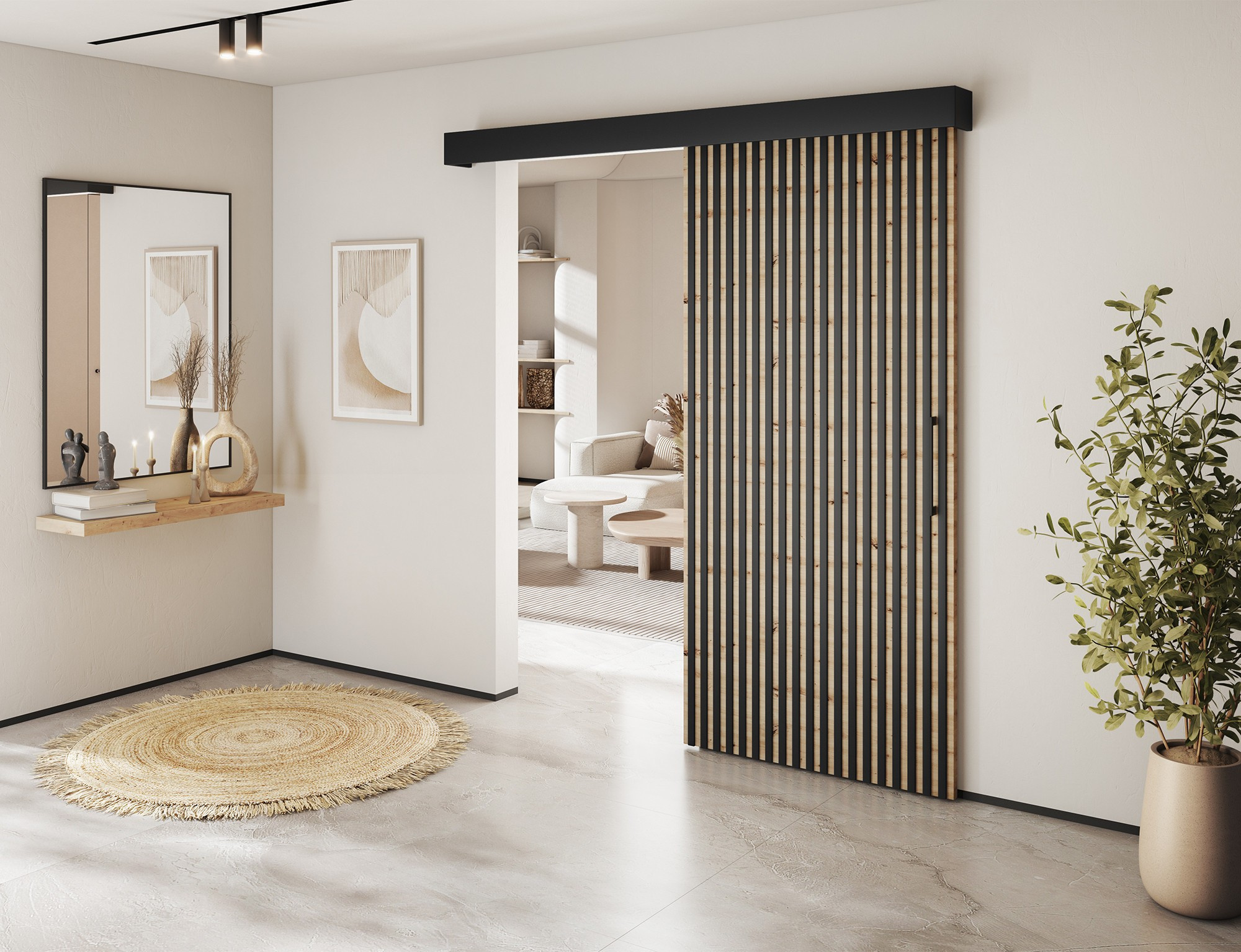 Posuvné dveře Tauricio, o rozměrech 96x205 cm, jsou moderním a funkčním interiérovým řešením vyrobeným z odolné dřevotřísky a syntetického materiálu v elegantním matně černém provedení, které dokonale doplňuje minimalistické a industriální interiéry. Systém All-in-One kombinuje plnou funkčnost v jedné konstrukci, vybavené hladce fungující kolejnicí, která zajišťuje tichý a pohodlný provoz, spolu s pevnou kartáčovanou hliníkovou rukojetí, která zdůrazňuje moderní charakter dveří. Ideální jako dělicí stěna, dveře šatníku, spíže nebo vstup do kanceláře, umožňující optimální využití prostoru. Sada neobsahuje montážní hmoždinky do zdi – jejich výběr by měl být individuálně přizpůsoben typu povrchu zdi, aby byla zajištěna stabilní a bezpečná instalace. Posuvné dveře Tauricio jsou stylovou a praktickou volbou pro náročné uživatele, kteří si cení estetiky a odolnosti.