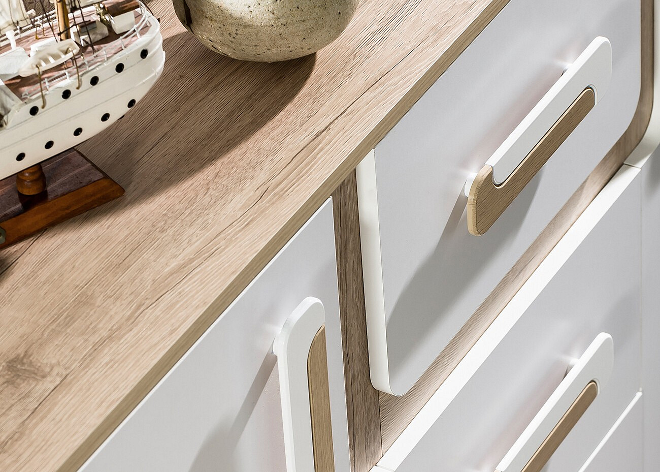 - Úchytky: Nábytek je vybavena úchytkami ze syntetického materiálu, které jsou nejen odolné, ale také příjemné na dotek. Jejich moderní design přispívá k celkovému estetickému dojmu.