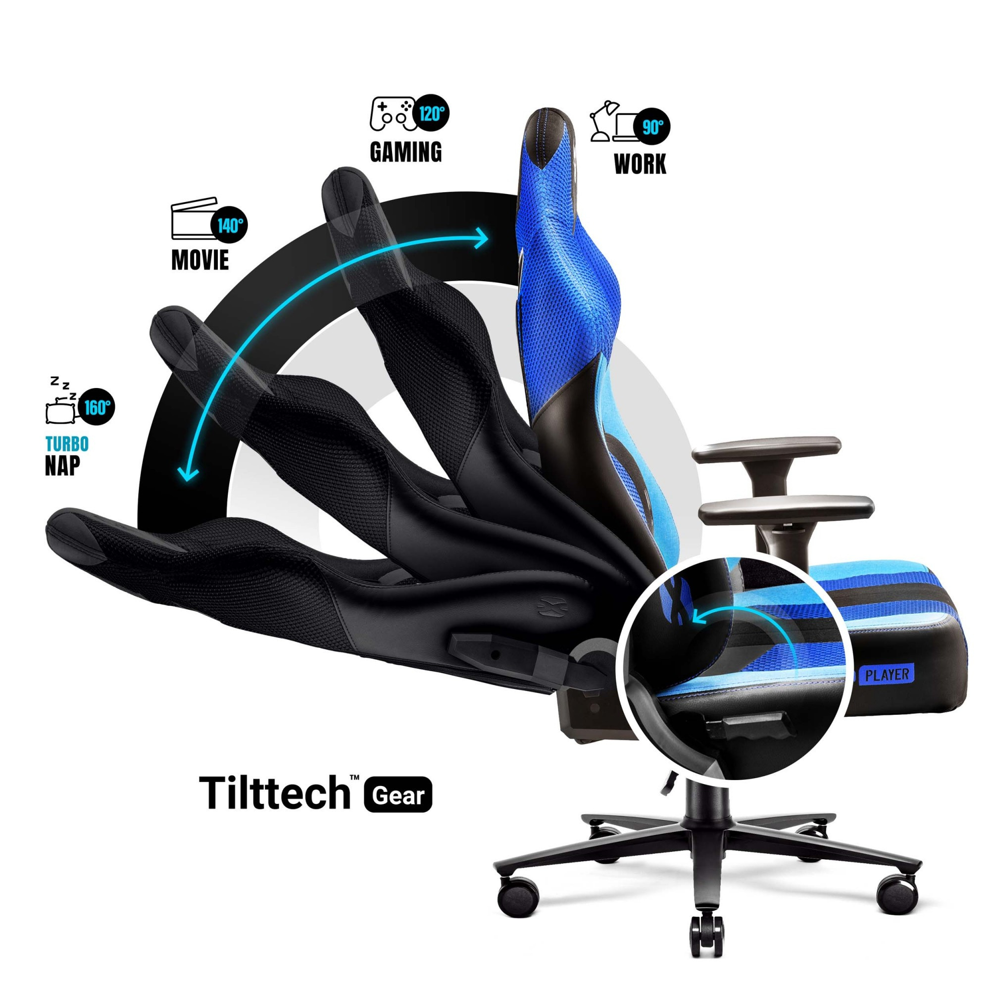 X-Player 2.0 je vybaven řadou regulačních mechanismů, které vám umožní přizpůsobit křeslo přesně vašim potřebám. Systém Tilttech™ Butterfly umožňuje snadné a rychlé nastavení výšky sedadla. Páka mechanismu Tilttech™ Gear vám umožní nastavit optimální úhel sklonu opěradla. A pokud si chcete odpočinout, můžete využít funkci houpání Tilttech™ Swing.