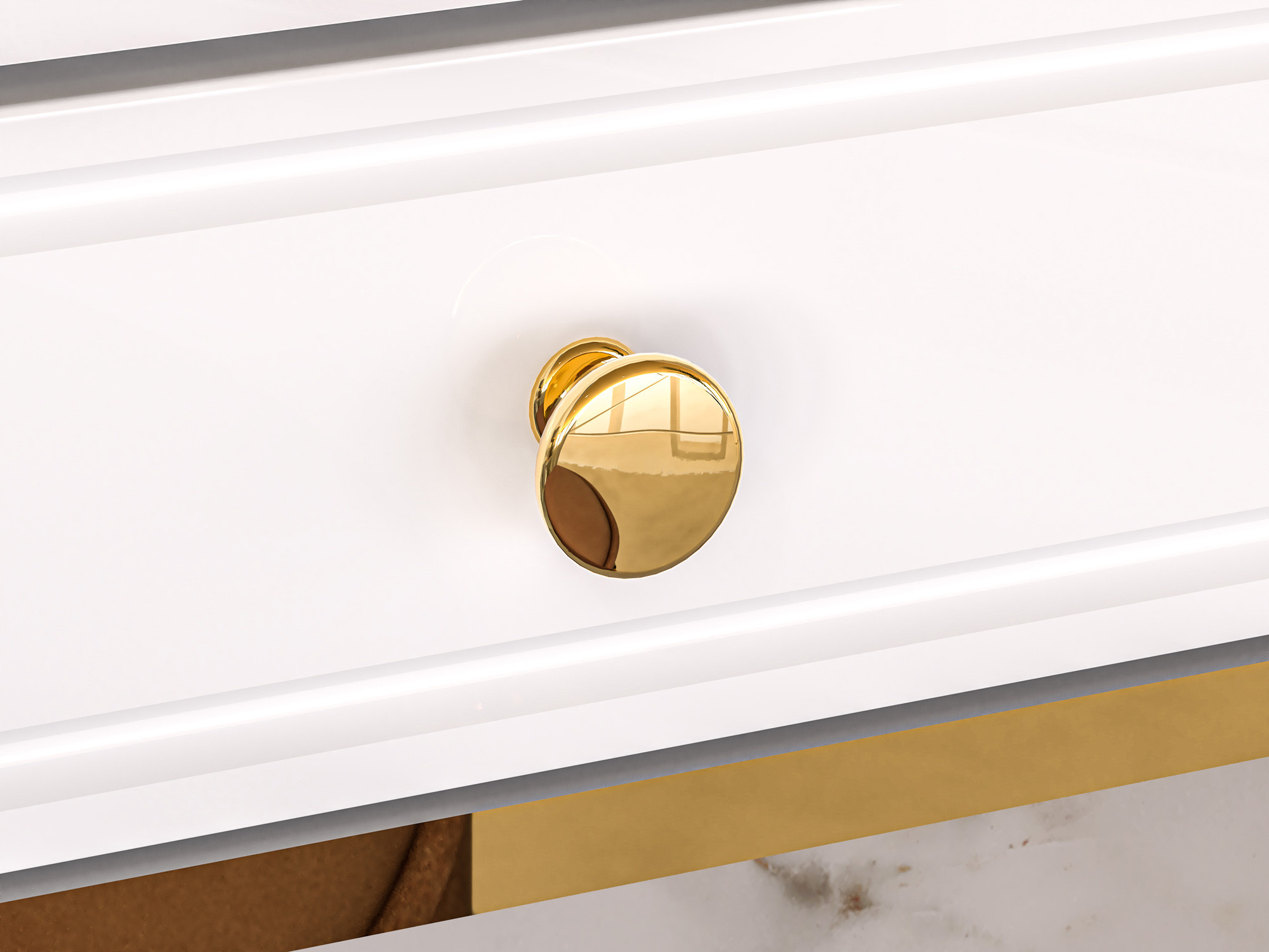 - Frézovaná MDF deska v bílém lesku je použita na dvířkách a vrchních částech nábytku