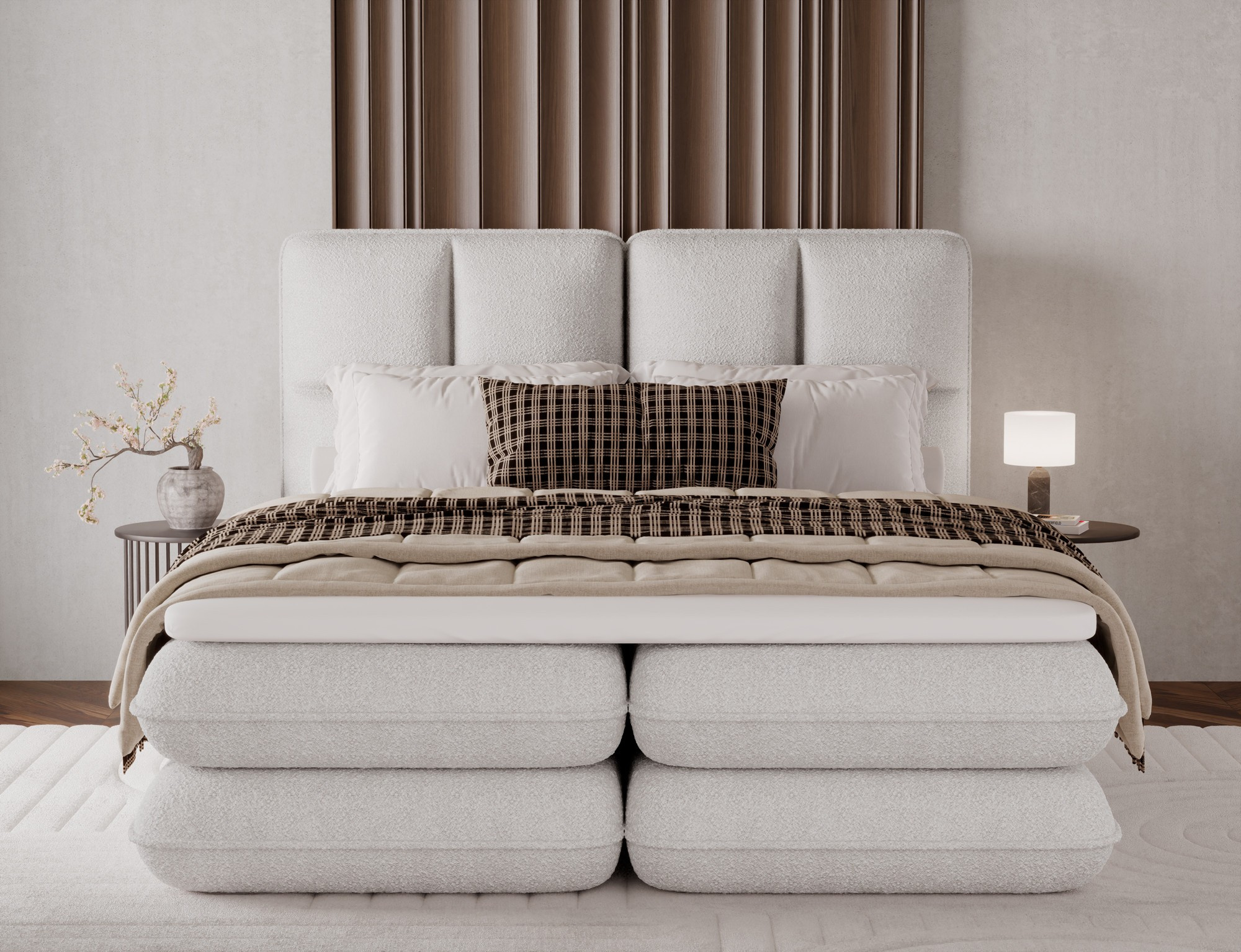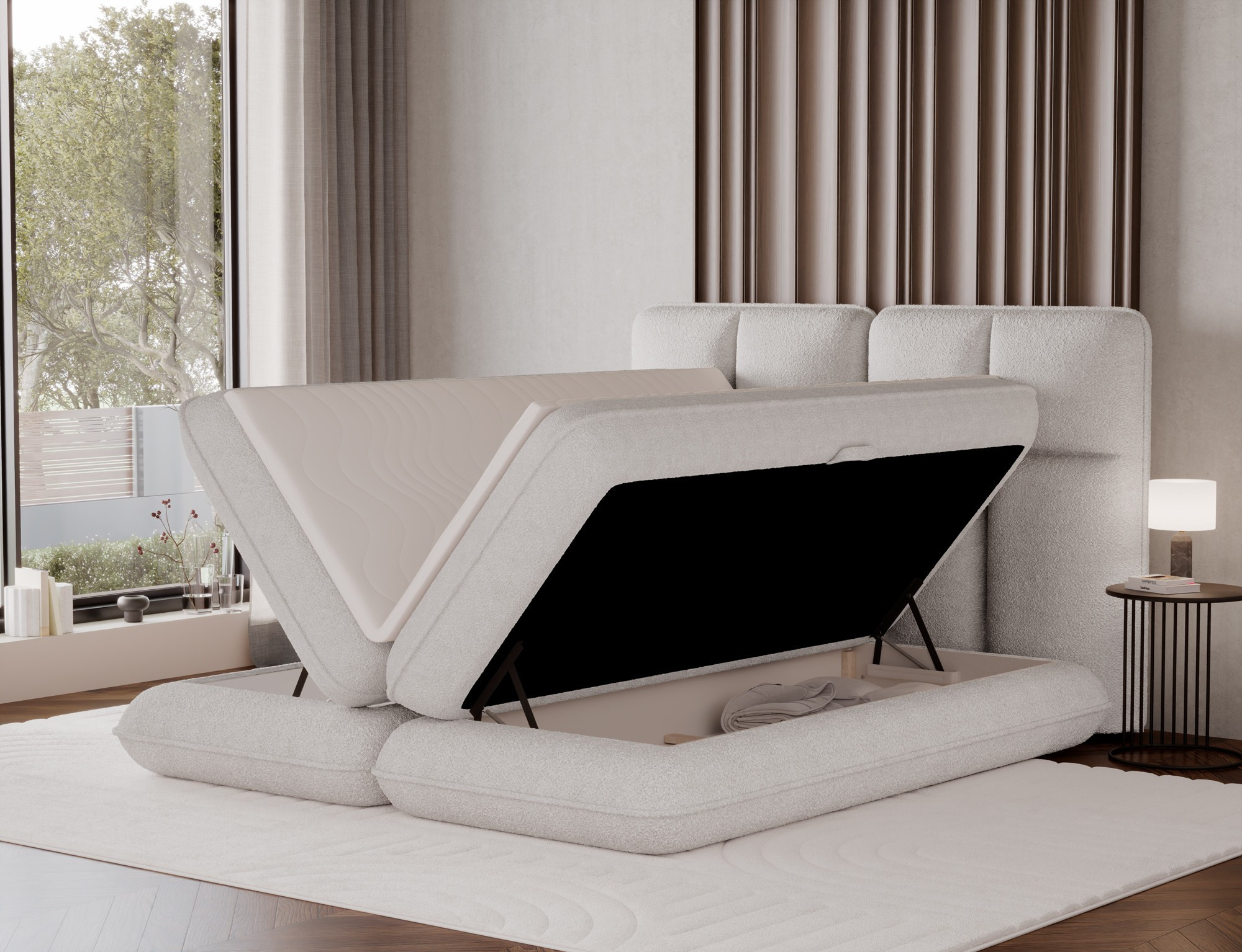The Tonila bed is a modern and functional upholstered bed that combines sleeping comfort with practical solutions for the bedroom, making it an excellent choice for both contemporary and classic interiors; its solid construction with a height of 127 cm and a length of 235 cm ensures stability and comfortable back support, while the seat filling consisting of T2130 foam (storage box), bonell springs, and T2540 foam with a thickness of 2.5 cm provides proper body support and a high level of everyday comfort; the bed is equipped with a practical bedding storage compartment, which helps keep the bedroom organized, and the overall design is complemented by black furniture legs that add a modern and lightweight character; the Tonila model is available in three popular sizes: 140x200 cm, 160x200 cm, and 180x200 cm, allowing easy adjustment to the size of the room and individual needs, making it a comfortable, durable, and stylish bed for the bedroom.