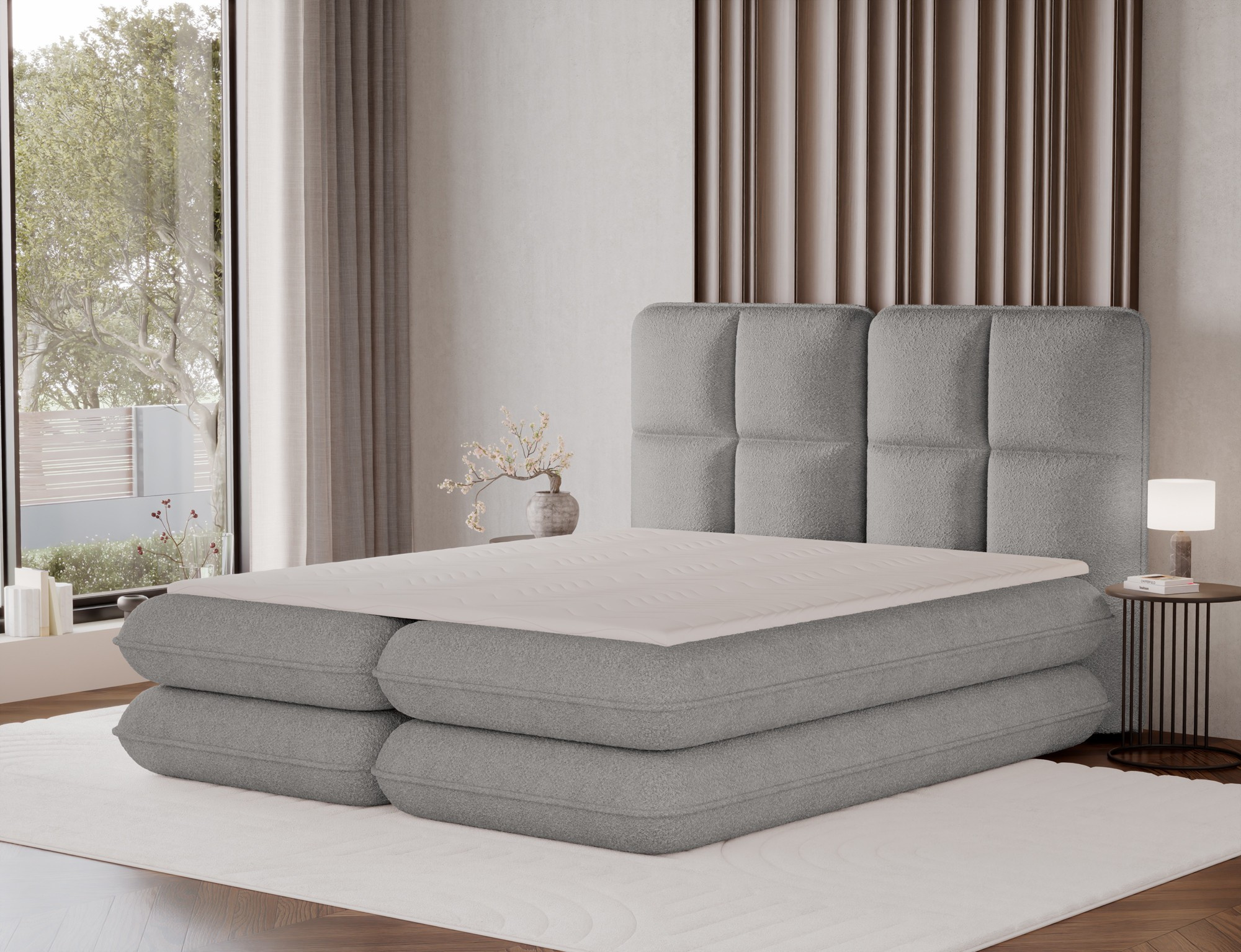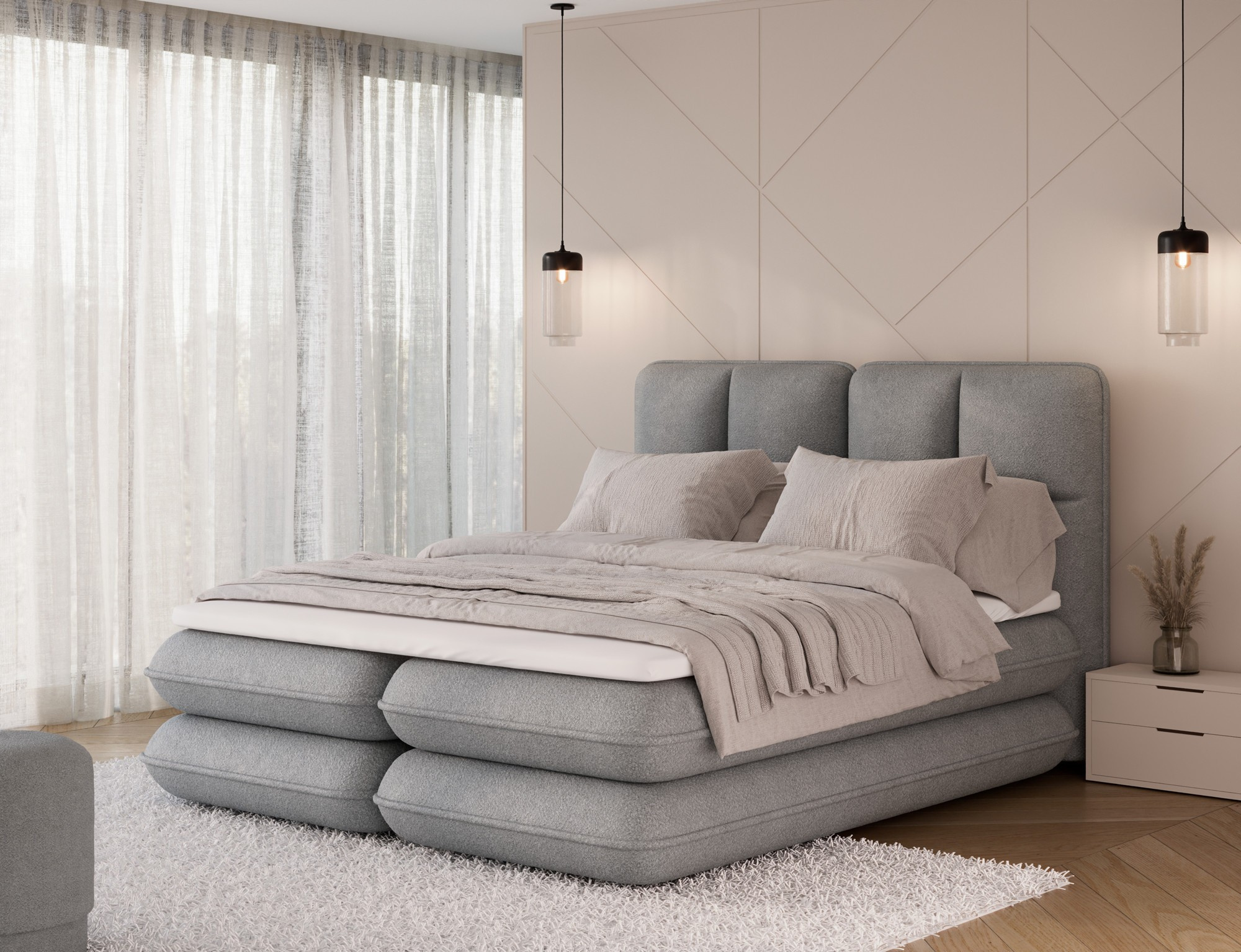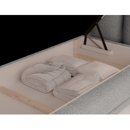 The Tonila bed is a modern and functional upholstered bed that combines sleeping comfort with practical solutions for the bedroom, making it an excellent choice for both contemporary and classic interiors; its solid construction with a height of 127 cm and a length of 235 cm ensures stability and comfortable back support, while the seat filling consisting of T2130 foam (storage box), bonell springs, and T2540 foam with a thickness of 2.5 cm provides proper body support and a high level of everyday comfort; the bed is equipped with a practical bedding storage compartment, which helps keep the bedroom organized, and the overall design is complemented by black furniture legs that add a modern and lightweight character; the Tonila model is available in three popular sizes: 140x200 cm, 160x200 cm, and 180x200 cm, allowing easy adjustment to the size of the room and individual needs, making it a comfortable, durable, and stylish bed for the bedroom.