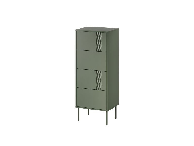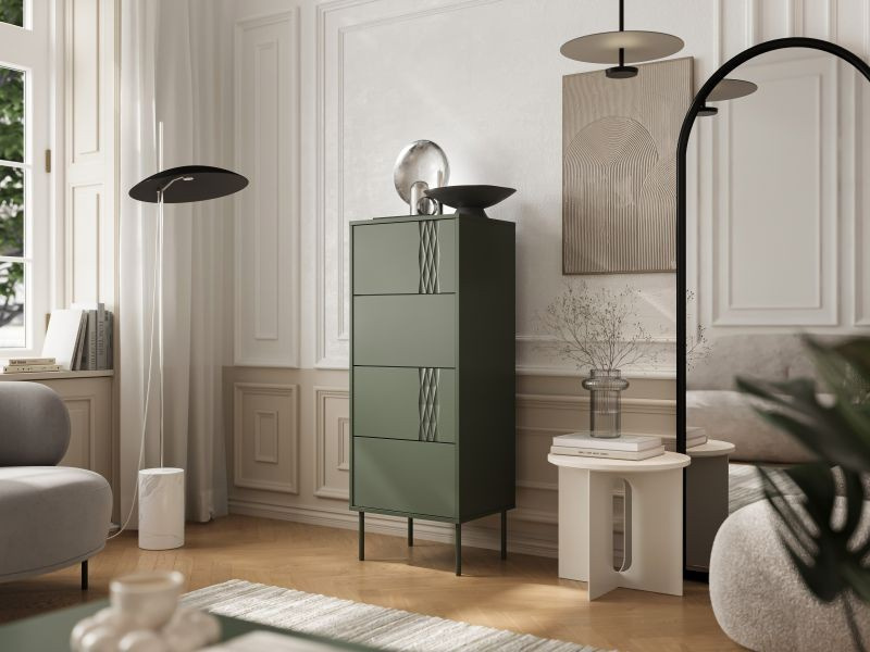 Zelená barva komody TRESSE 4S přináší do vašeho domova nádech přírody a klidu. Tento odstín je nejen moderní, ale také velmi univerzální, což umožňuje snadné kombinování s ostatním nábytkem a dekoracemi. Komoda se skvěle hodí do ložnice, obývacího pokoje, předsíně nebo kanceláře, kde se stane stylovým a praktickým doplňkem.