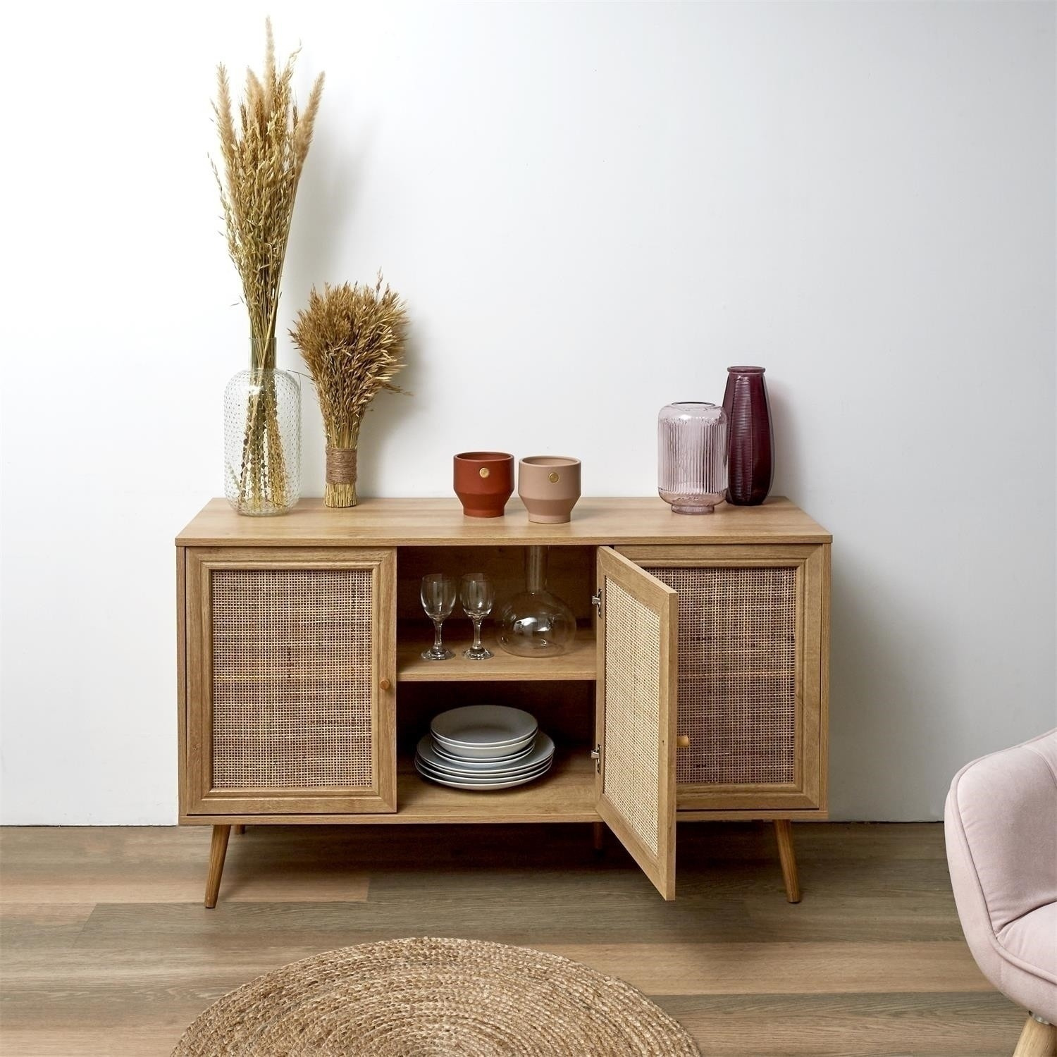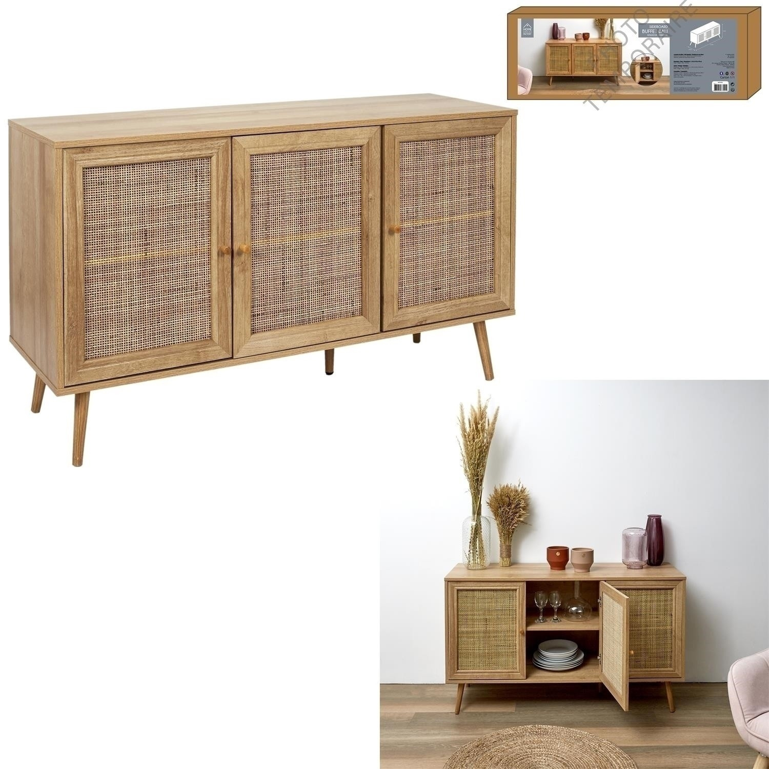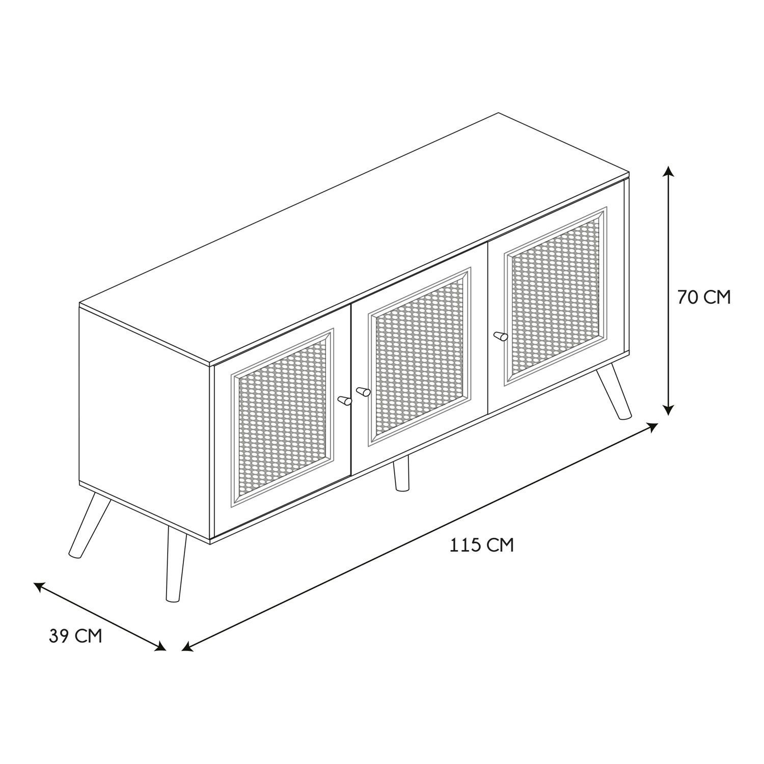 Třídveřová komoda Bali je nábytek s pletenými čelními stranami skříněk ve stylu boho. Základem komody je 5 nohou, které díky své konstrukci zajišťují stabilitu. Dodatečná pátá noha podpírá komodu uprostřed, díky čemuž do ní můžeme bez obav uložit těžký porcelán nebo příbory. Třídveřová nízká komoda Bali bude nejkrásnějším nábytkem ve vašem interiéru! - Hlavní složení: dřevotříska. Rozměry balení: 10,6x42x120 cm Nábytek vyžaduje vlastní montáž