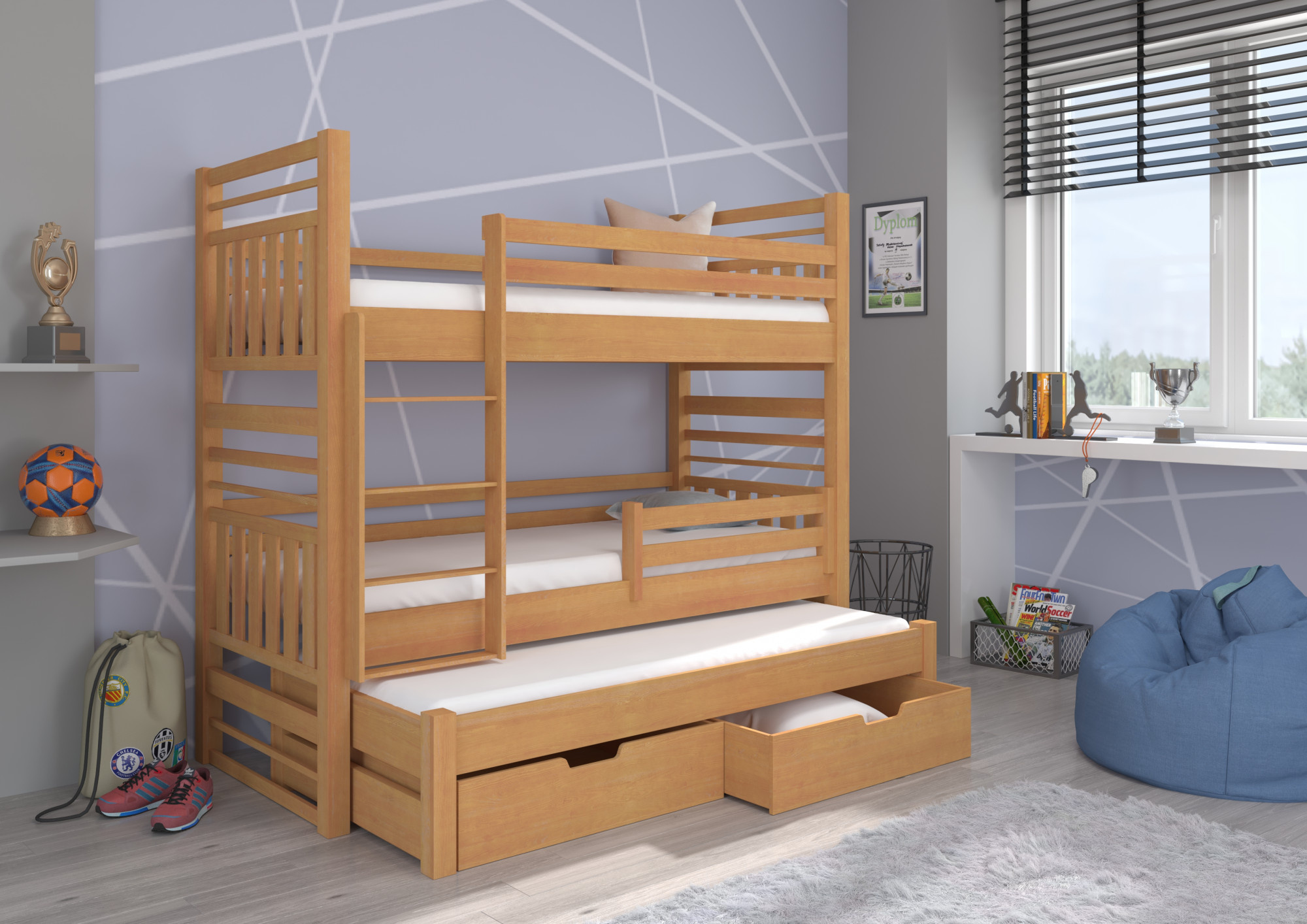 Patrová 3lůžková postel HIPPO je skvělý nápad na úsporu místa v malém dětském pokoji. Nábytek obsahuje schůdkový žebřík a dvě prostorné a funkční zásuvky na ložní prádlo. Navíc na dvou úrovních byly namontovány zábradlí zvyšující bezpečnost během spánku. Matrace nejsou součástí postele.