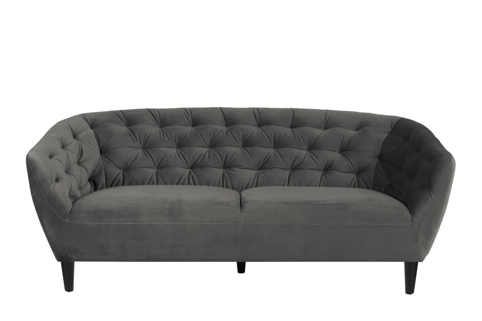 Trojmístná pohovka Ria se hodí jak do glamour interiéru, tak do skandinávského. Pohovka byla potažena velmi měkkou a na dotek příjemnou sametovou látkou. Na sedáku i opěradle byly umístěny elegantní prošívání zakončené knoflíky. Tkanina, kterou použili k potažení pohovky, je tkanina VIC Dark grey 28. Sofa má čtyři velmi odolné nohy z kaučukového dřeva. Nohy byly dodatečně zabezpečeny tím, že byly natřeny na černo. Hmotnost: 39,8 kg. Rozměry kartonu: 65cm x 193cm x 84cm Výška sedáku: 46 cm Šířka sedáku: 152 cm Hloubka sedáku: 55 cm Výška područek: 42 cm