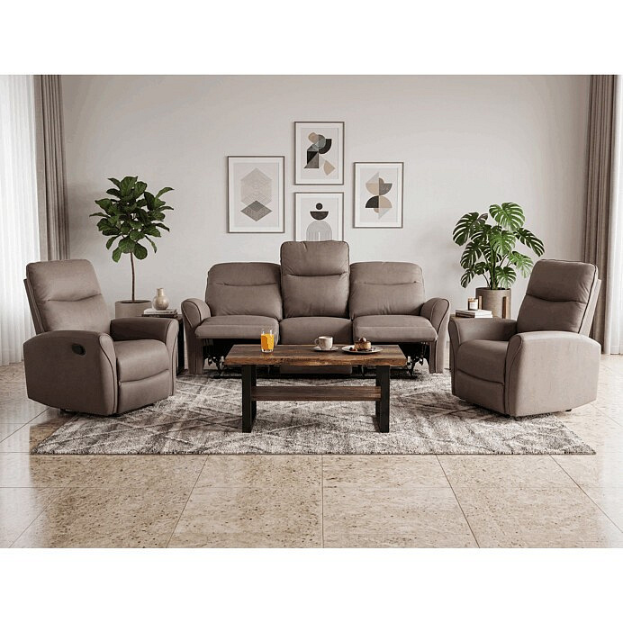 Moderní sedací souprava 3+1+1 v béžovém odstínu s efektem vintage přináší do obývacího pokoje nadčasovou eleganci a maximální komfort. Pohovka je rozkládací a jednotlivá křesla disponují manuálním polohováním, díky kterému si snadno nastavíte ideální pozici pro relaxaci. Kvalitní látkové čalounění s vintage vzhledem působí luxusně a zároveň útulně. Stabilní kovové prvky a pohodlné polstrování zaručují dlouhou životnost i vysoký komfort sezení. Tento set je skvělou volbou pro moderní interiéry a je produktem značky Autronic.