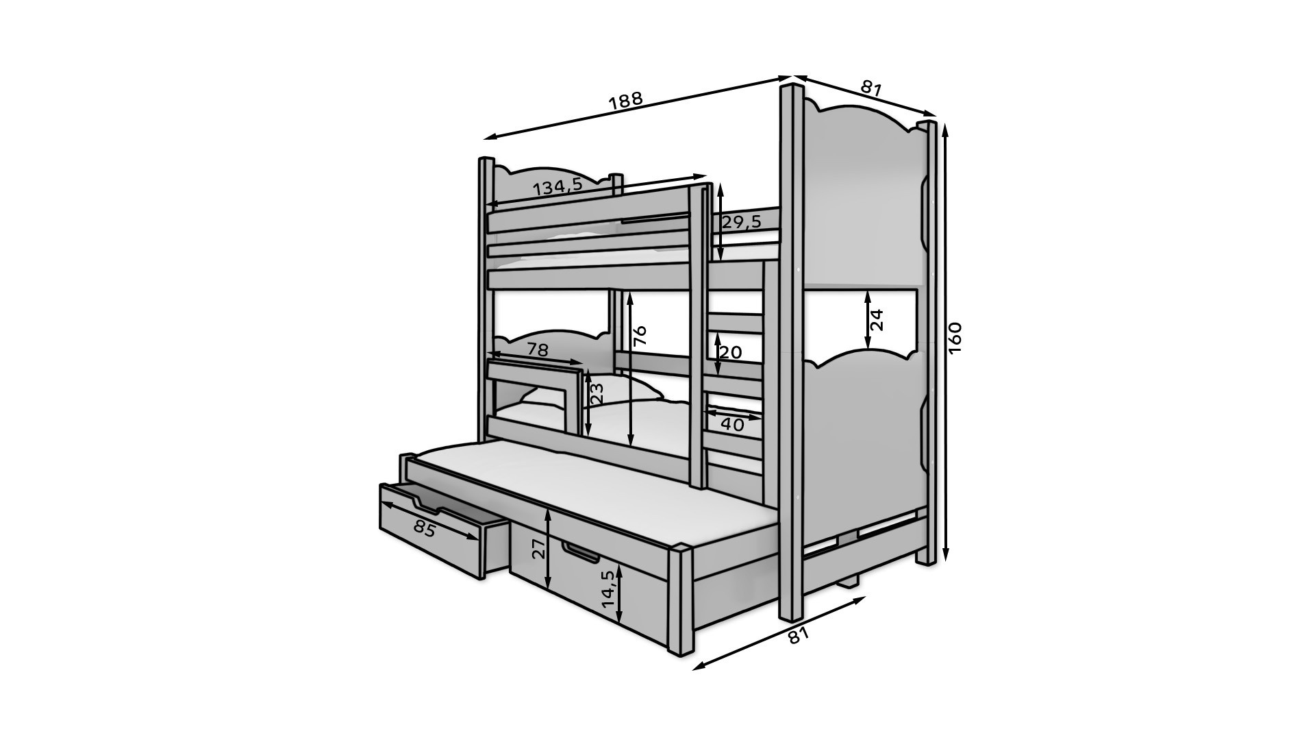 Patrová 3lůžková postel LETICIA je skvělý nápad na úsporu místa v malém dětském pokoji. Nábytek má stabilní schůdkový žebřík a ochranné zábradlí umístěné téměř na každé straně postele, díky kterým máte jistotu, že vaše dítě je během spánku plně v bezpečí. Navíc dole se nacházejí dvě prostorné a funkční zásuvky na ložní prádlo. Spolu s postelí obdržíte sadu tří pěnových matrací s bavlněnými potahy na zip.