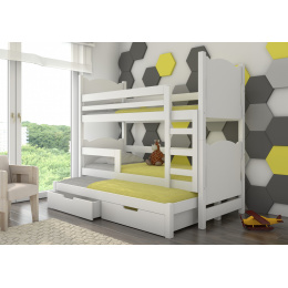 Patrová 3lůžková postel LETICIA je skvělý nápad na úsporu místa v malém dětském pokoji. Nábytek má stabilní schůdkový žebřík a ochranné zábradlí umístěné téměř na každé straně postele, díky kterým máte jistotu, že vaše dítě je během spánku plně v bezpečí. Navíc dole se nacházejí dvě prostorné a funkční zásuvky na ložní prádlo. Spolu s postelí obdržíte sadu tří pěnových matrací s bavlněnými potahy na zip.