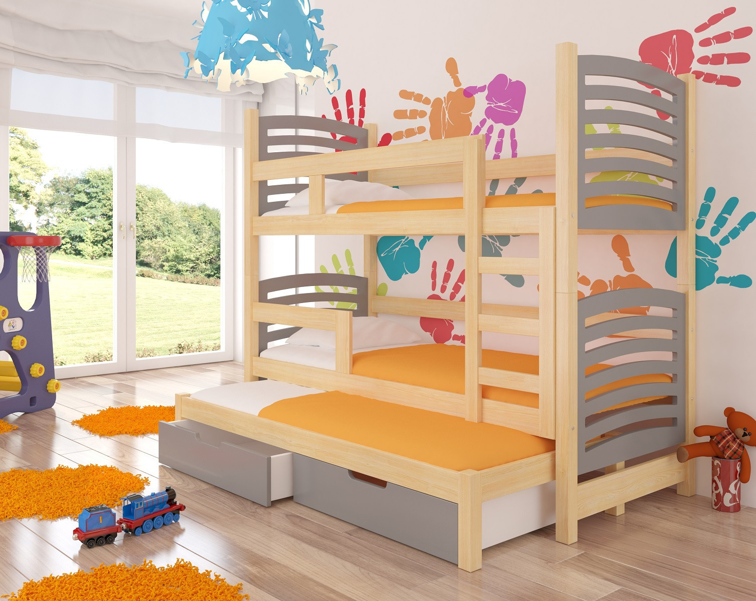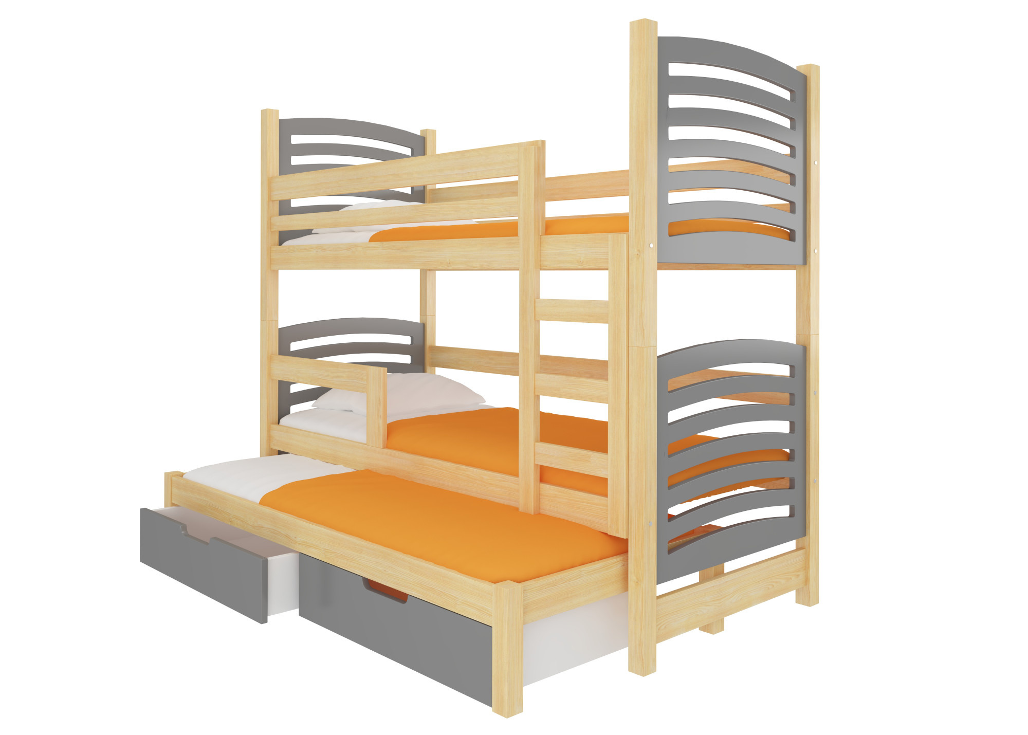 Třílůžková patrová postel s matracemi SORIA Pine+Gray
