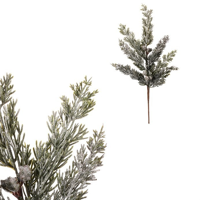 Umělá větev túje v zeleném provedení s jemným ojíněním a dekorativními plody přináší do interiéru přírodní atmosféru bez nutnosti údržby. Plastové listy jsou detailně tvarované a věrně napodobují strukturu skutečné túje, což zajišťuje dlouhodobou stálost vzhledu. Větev je vhodná pro aranžmá v květináčích, věncích nebo jako samostatný dekorativní prvek na stole či polici. Díky lehkému materiálu se snadno tvaruje a umisťuje do různých prostorů.