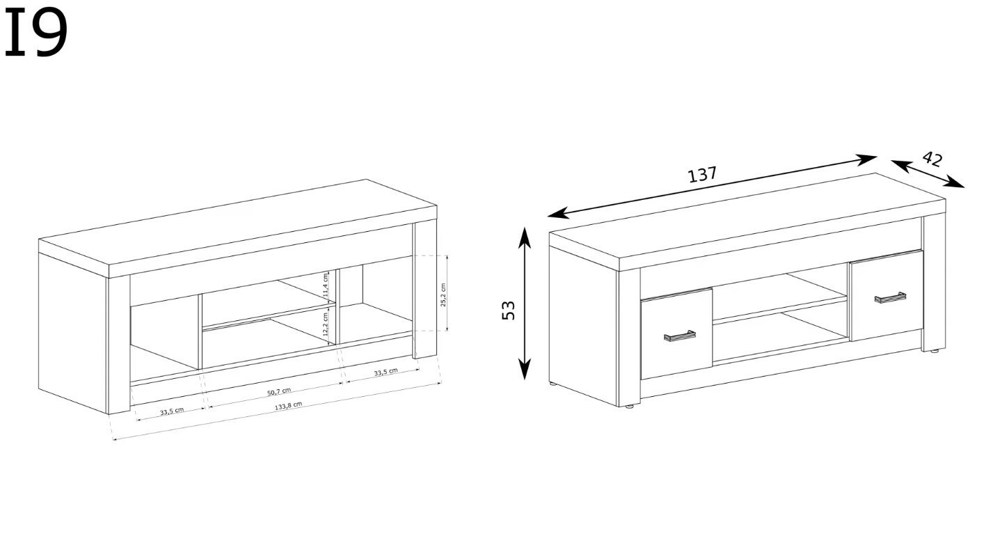 Jednoduchá skříňka RTV, vyrobená s důrazem na nejmenší detaily, o čemž svědčí pečlivě vyrobené a dokonale sladěné kovové úchytky. Je vybavena jednou policí uprostřed a dvěma bočními skříňkami, do kterých se vejde spousta věcí, knih, dokumentů. K dispozici je také LED osvětlení stolní desky. Ideální do obývacího pokoje pod televizi nebo rádio, případně do ložnice nebo pokoje pro hosty. Výrobek je celý vyroben z laminované desky. K dostání ve třech barvách.