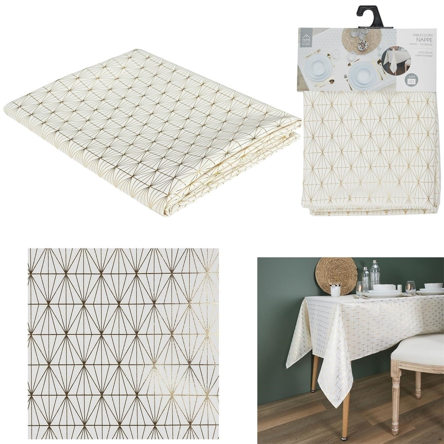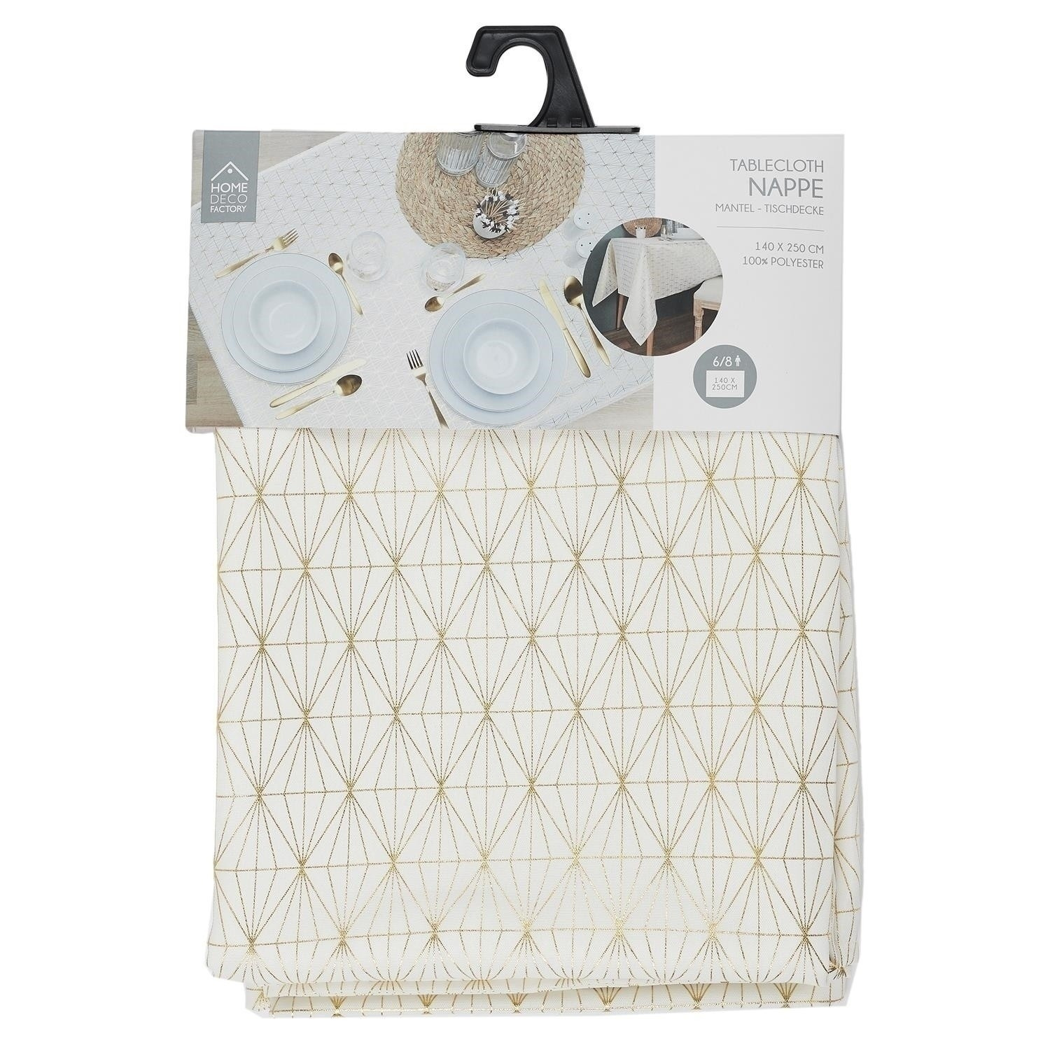 Obdélníkový ubrus ideální pro pokrytí svátečního stolu. Ubrus v bílém elegantním odstínu byl ozdoben jemnými, geometrickými vzory. Materiál: 100% polyester Rozměry 140x250 cm