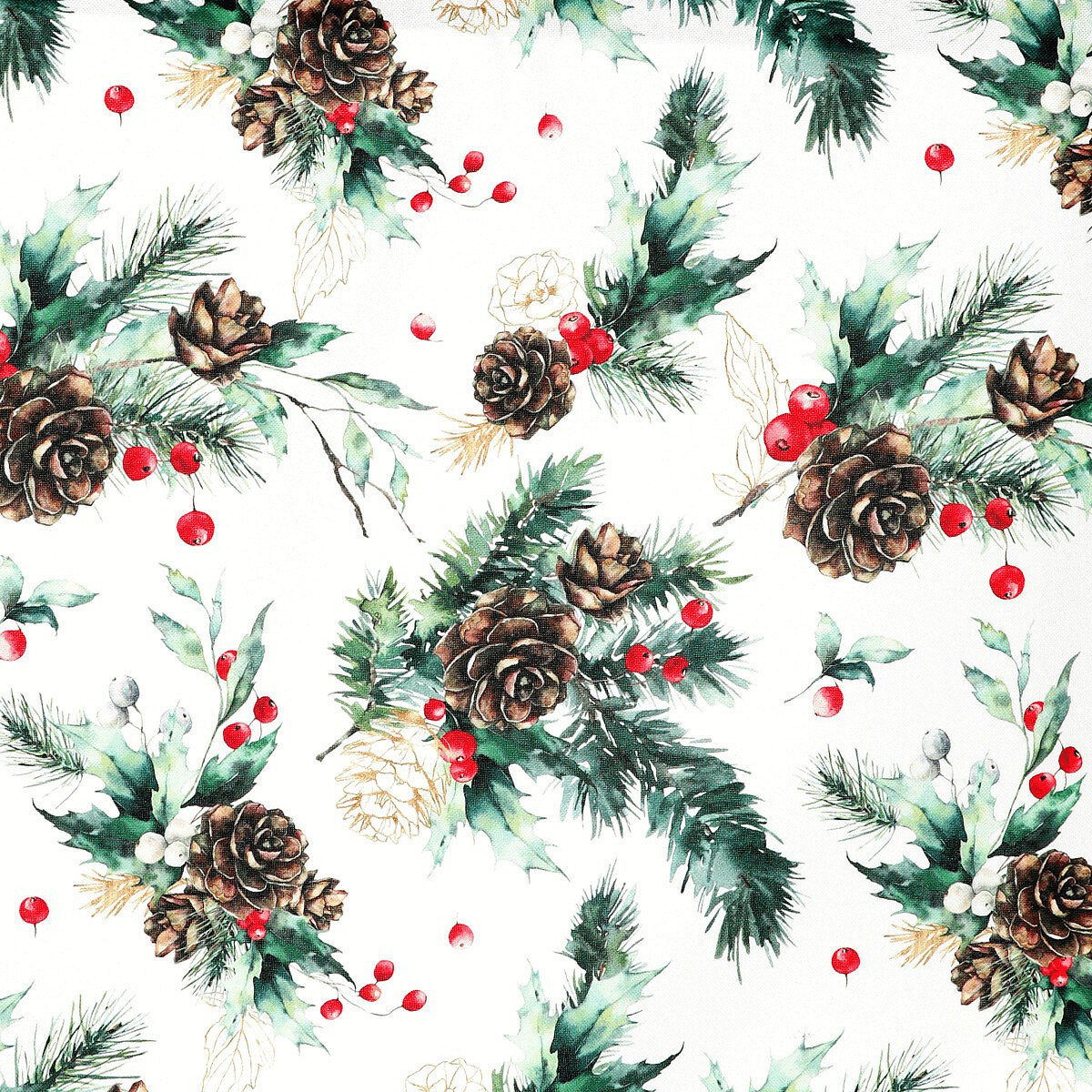 Vánoční ubrus s motivem jehličí, šišek a bobulí na čistě bílém podkladu přináší do interiéru svěží a elegantní sváteční atmosféru. Rozměr 130 × 160 cm je ideální pro větší stoly a rodinná setkání. Vyrobený ze 100 % polyesteru, snadno se udržuje a lze ho prát na 30 °C. Skvělá volba pro krásnou a praktickou výzdobu svátečního stolu.