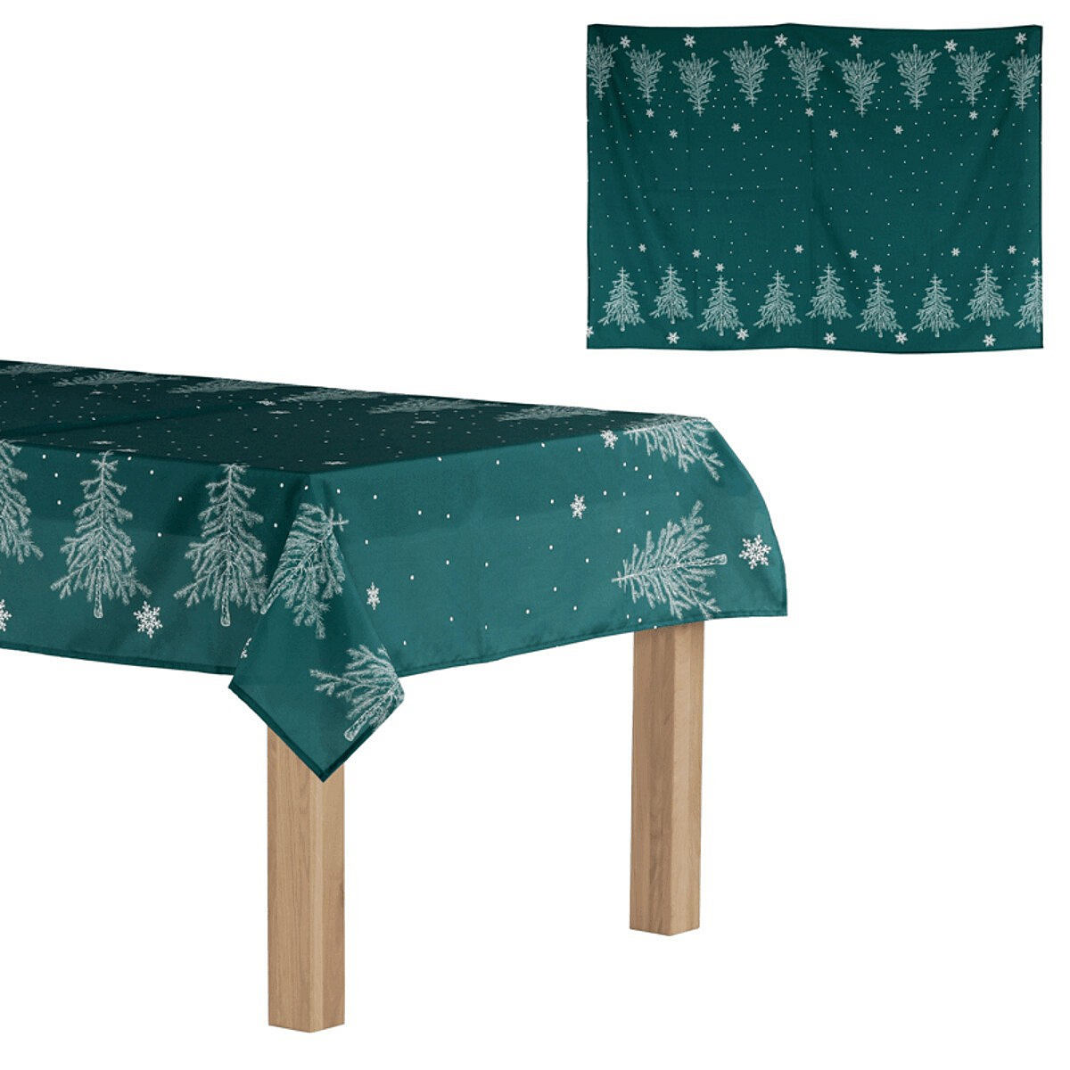 Připravte si prostor pro nezapomenutelné chvíle v jídelně s tímto výjimečným ubrusem v zelené barvě, typické pro nejkrásnější svátky v roce. Stromečky na ubruse jsou jemné a vkusné, dodávají prostoru eleganci a harmonii. Padající sněhové vločky pak přinášejí do vaší jídelny pocit magie a kouzla vánočních svátků.