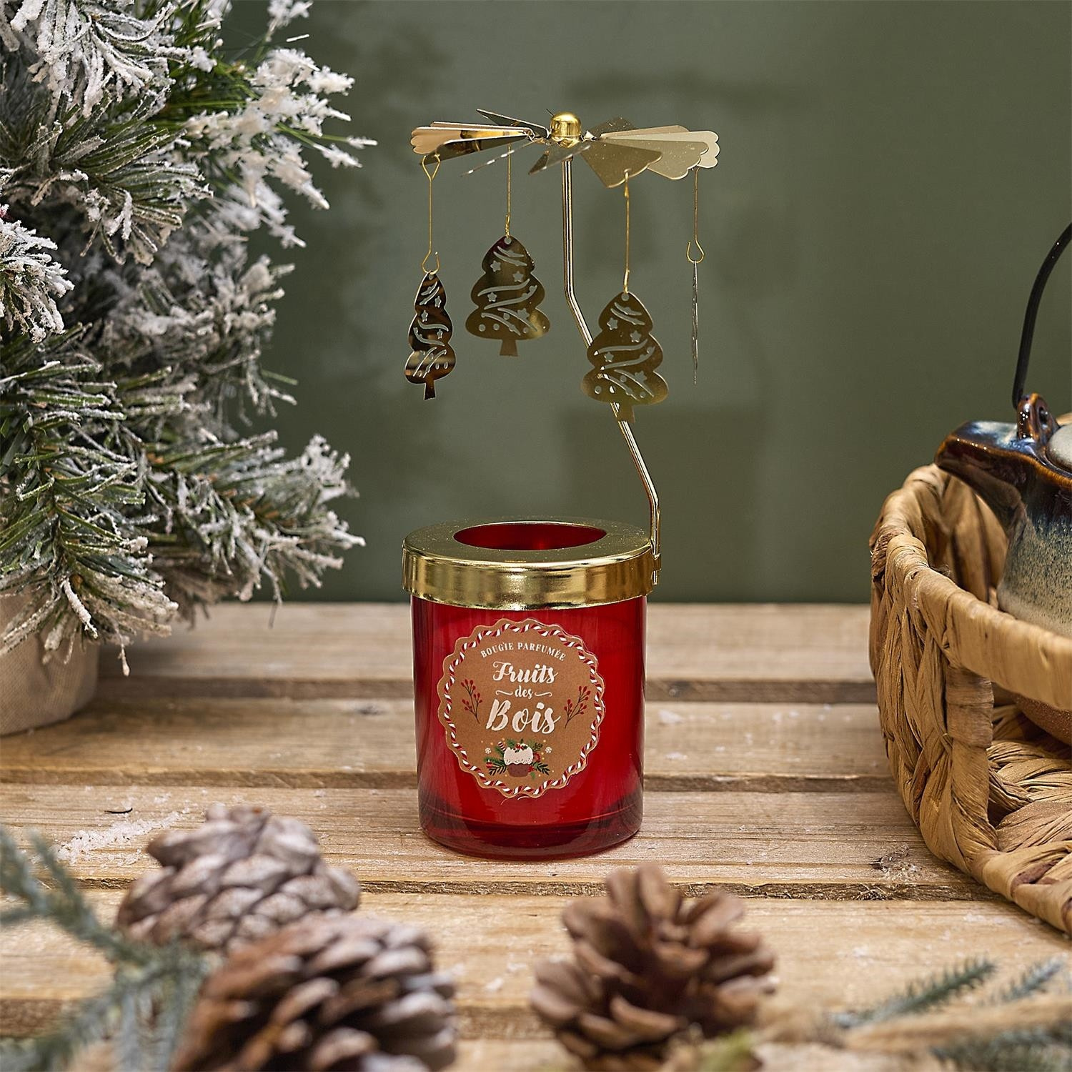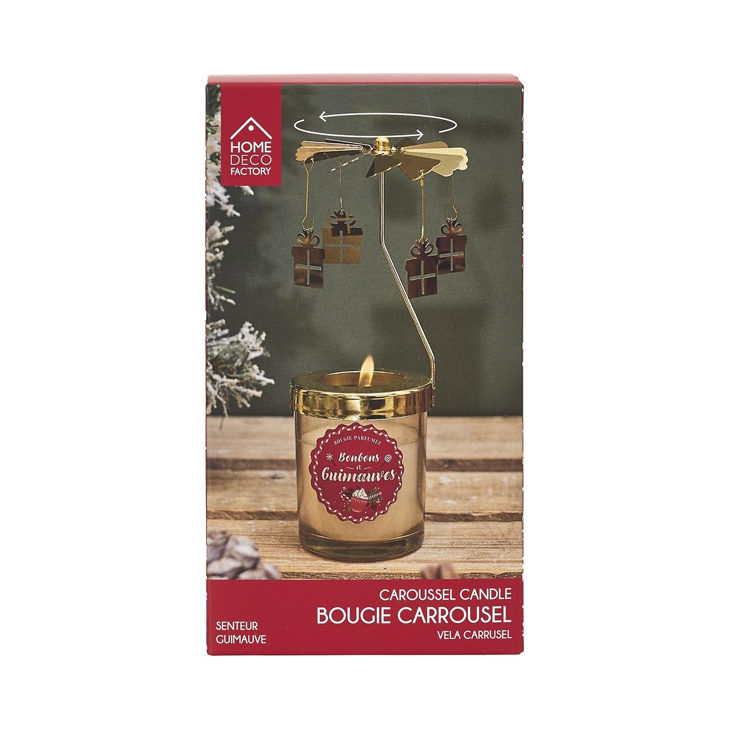 Vonná svíčka, která dodá atmosféru nejen díky vůni perníčků, ale také díky otáčejícímu se zlatému kolotoči. Kolotoč poháněný teplem ze svíčky se otáčí a vytváří magickou atmosféru. Vosková hmota použitá do svíčky: parafín. Sklenička vyrobená ze skla. Kolotoč vyrobený z kovu natřeného na zlatou barvu. Hmotnost parafínu: 85g. Bavlněný uzel