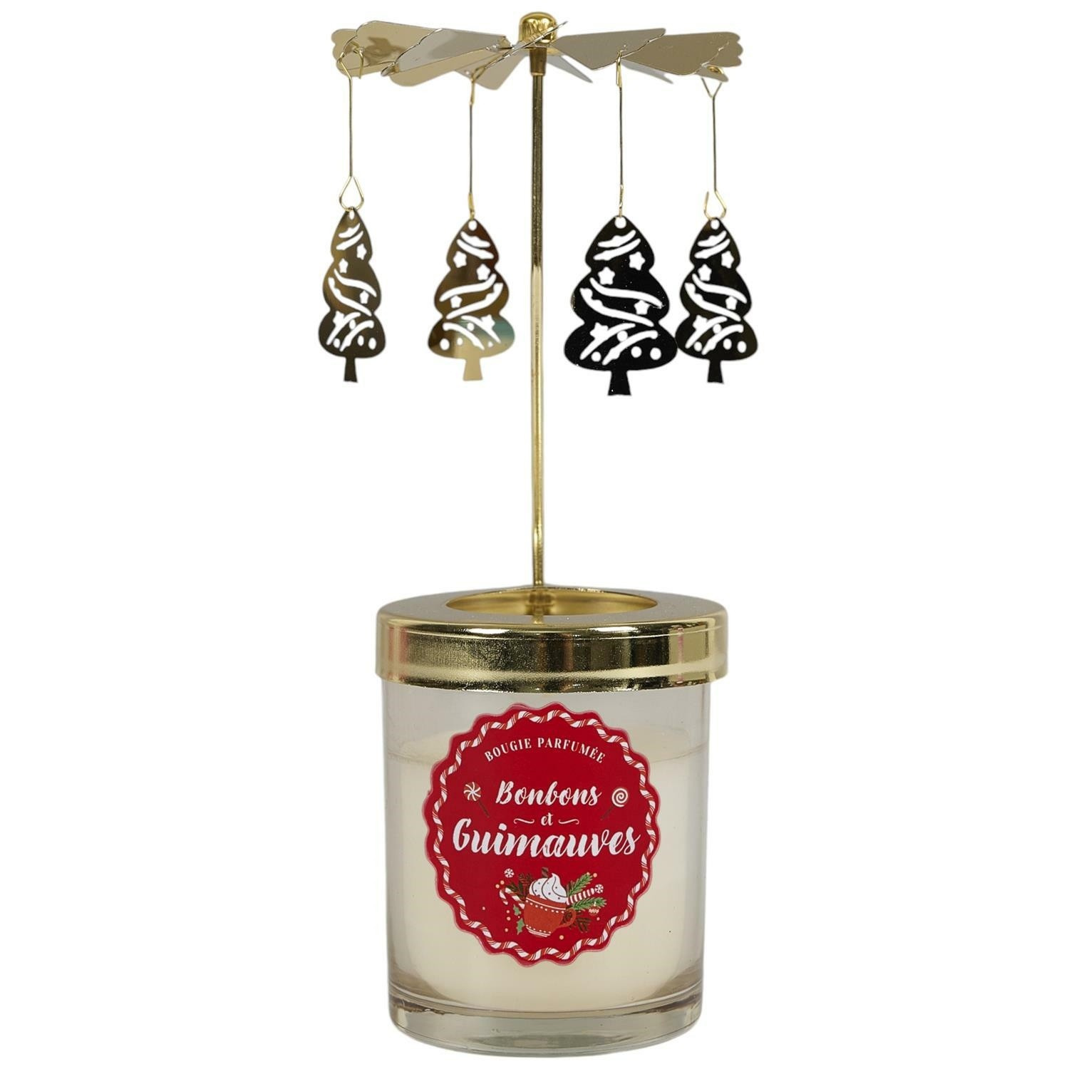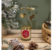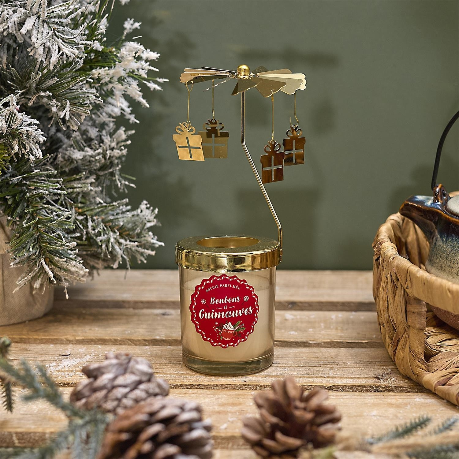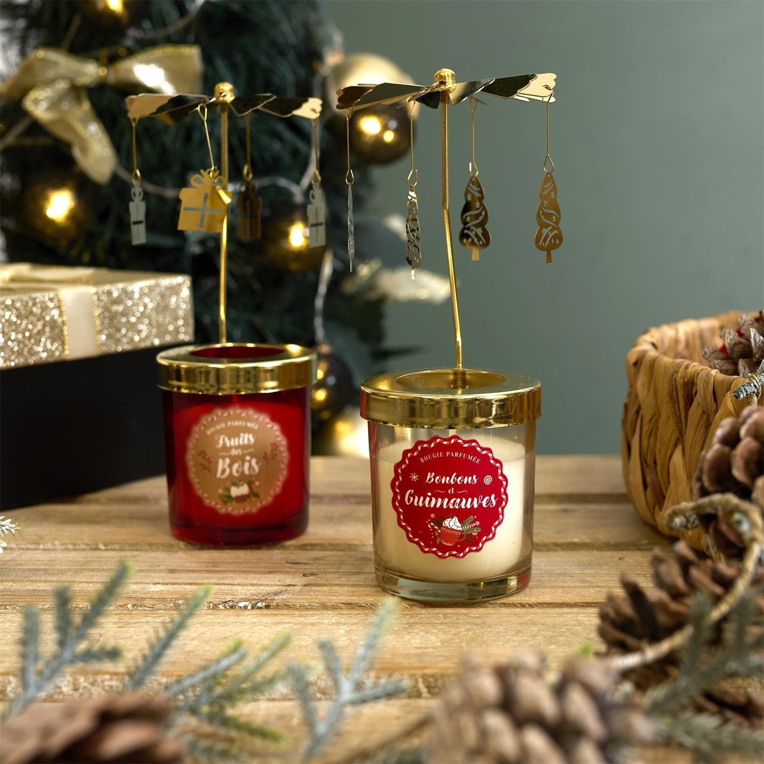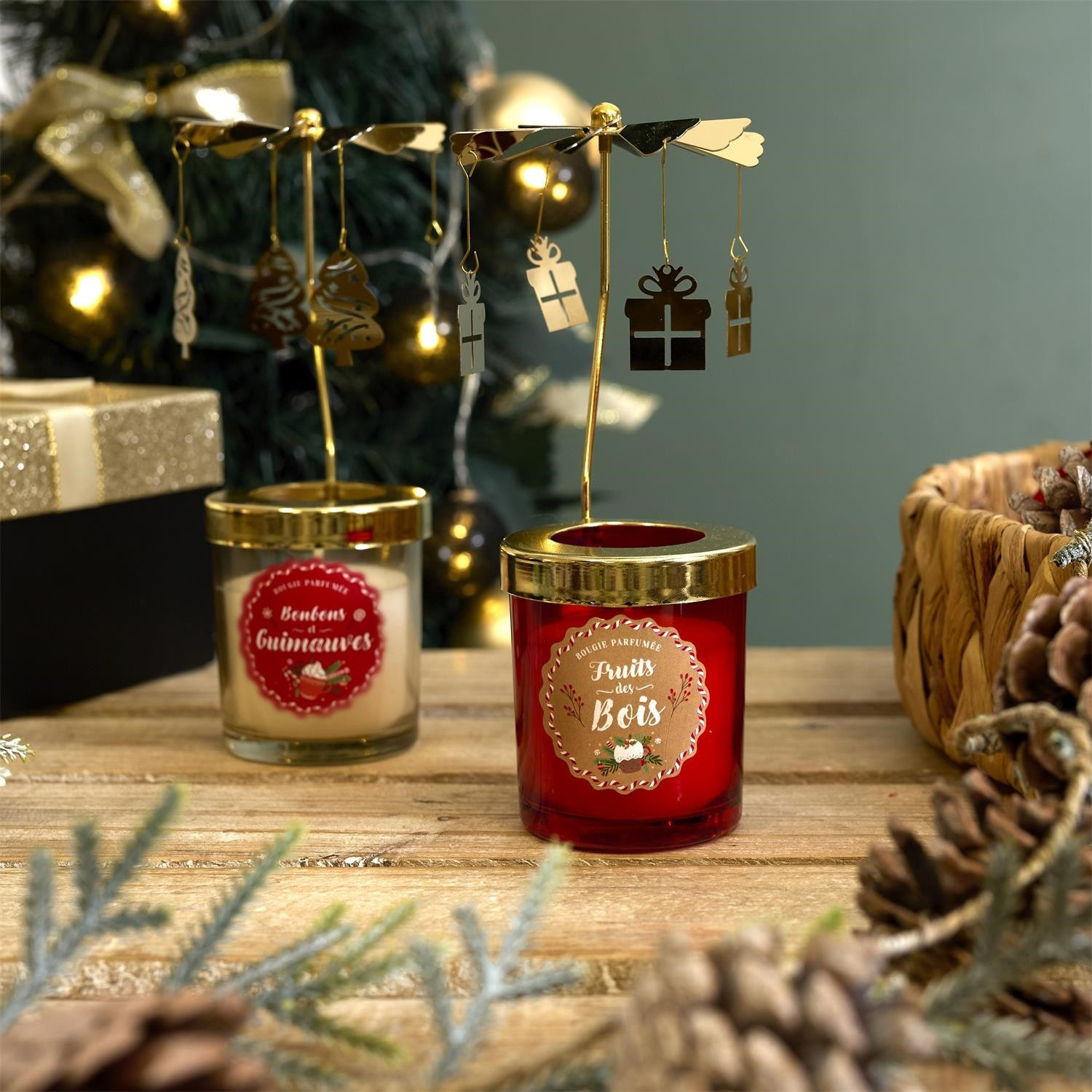 Vonná svíčka, která navodí atmosféru nejen díky vůni brusinek, ale také díky otáčejícímu se zlatému kolotoči. Kolotoč poháněný teplem ze svíčky se otáčí a vytváří magickou atmosféru. Vosková hmota použitá do svíčky: parafín. Sklenička vyrobená ze skla. Kolotoč vyrobený z kovu natřeného na zlatou barvu. Hmotnost parafínu: 85g. Bavlněný uzel