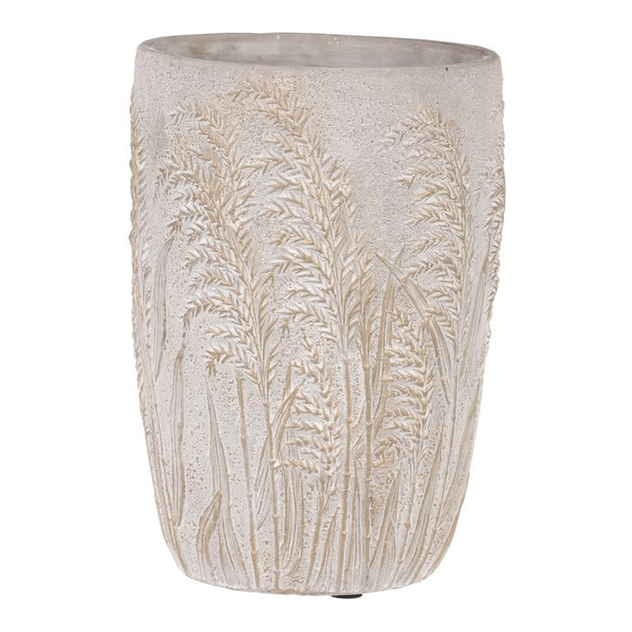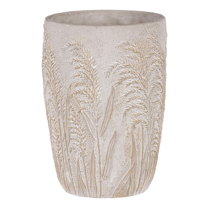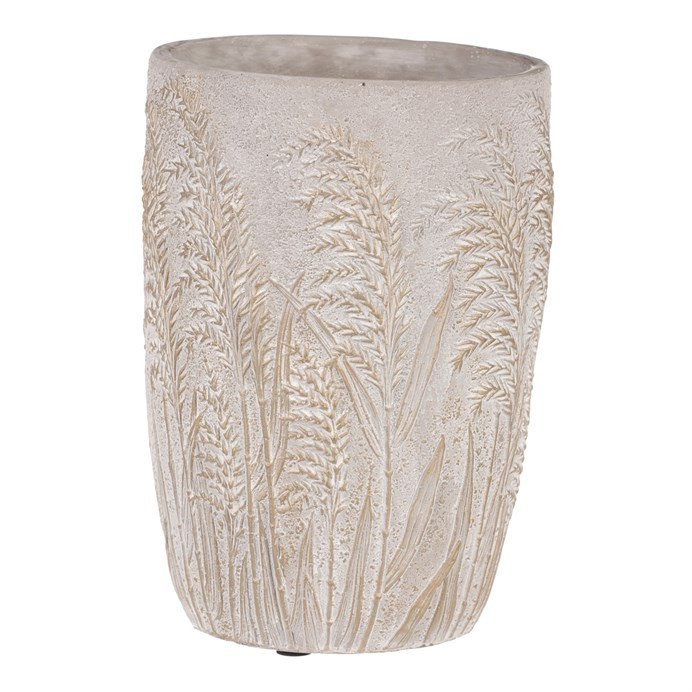 Šedá betonová váza je skvělým prostředkem, který umocní krásu vašich květin, či jiných ozdob v ní umístěných. Její jednobarevné provedení s motivem rozkvetlých travin vytváří elegantní a vkusný design. Betonový obal má nespornou výhodu v tom, že je těžší a poskytuje vyšší stabilitu. Je zcela nepropustná, a když je třeba, zadržuje vodu a chrání okolní prostředí před vlhkostí. Naopak rostlinám poskytuje lepší podmínky, takže i řezané květiny vydrží delší dobu v dobré kondici. Váš interiér tím obohatíte o vkusný dekorativní prvek, který bude plnit estetickou i praktickou funkci na jedničku.
