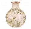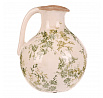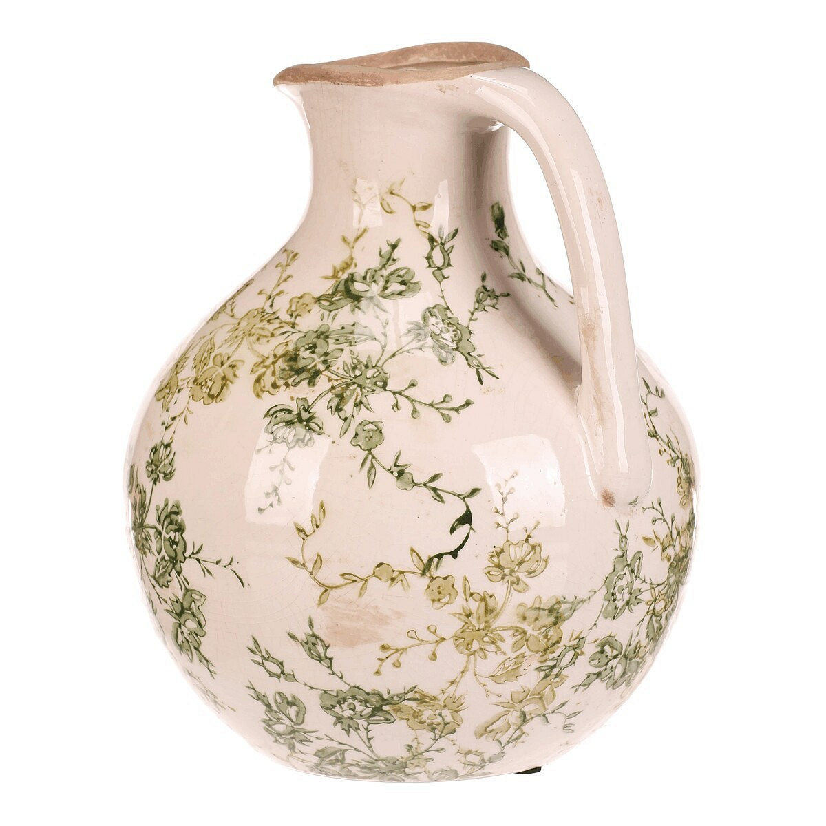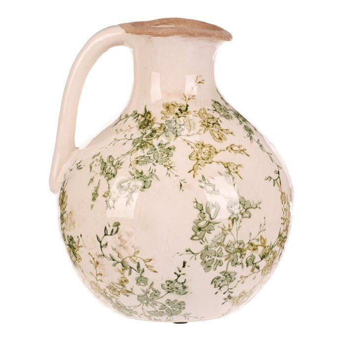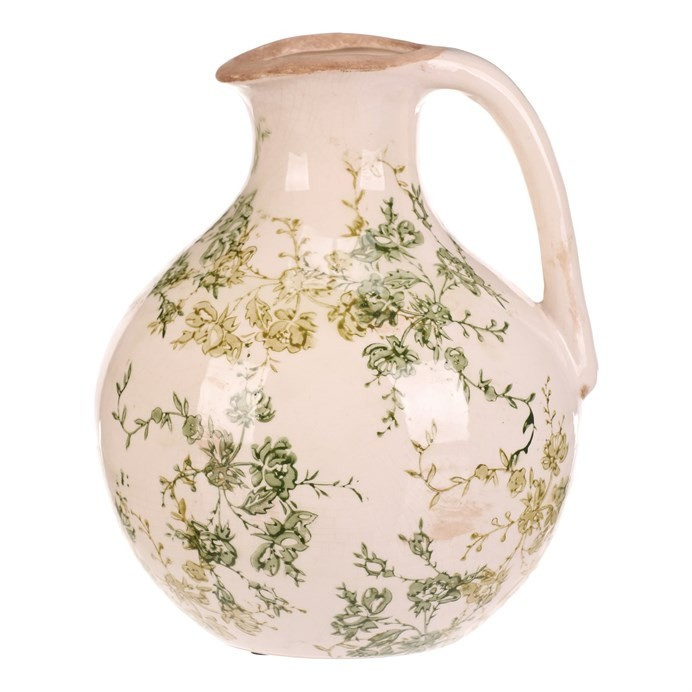 Keramická váza ve tvaru džbánku v retro stylu zaujme svým jemným dekorem zelených květů na krémovém podkladu. Její zaoblený tvar s úzkým hrdlem a praktickým uchem umožňuje snadné nalévání i dekorativní využití. Povrch je glazovaný s jemnou patinou, která podtrhuje vintage charakter výrobku. Váza je vhodná pro aranžmá sušených i čerstvých květin a díky svému rozměru L se stane výrazným doplňkem interiéru s rustikálním nebo retro nádechem.